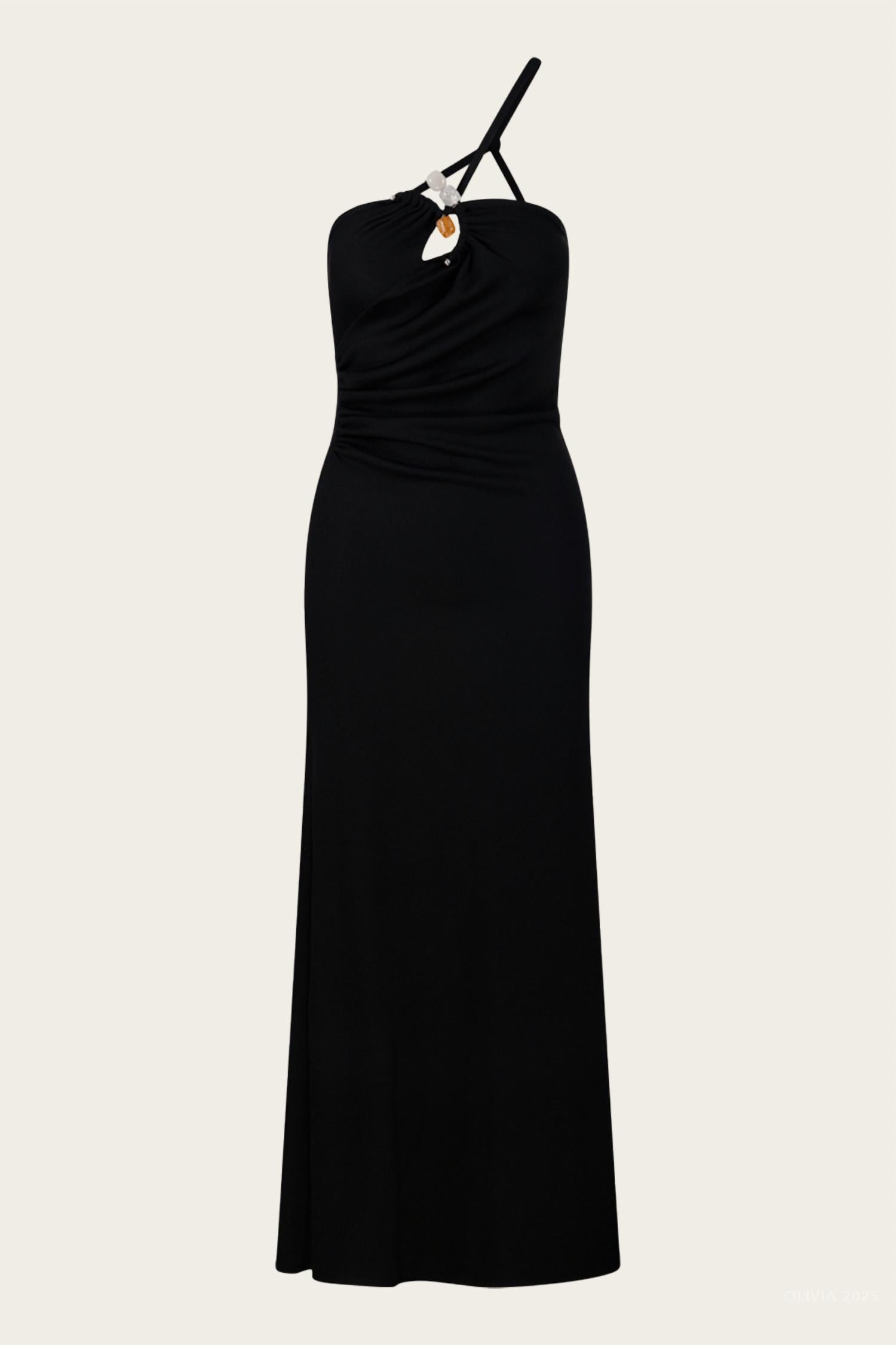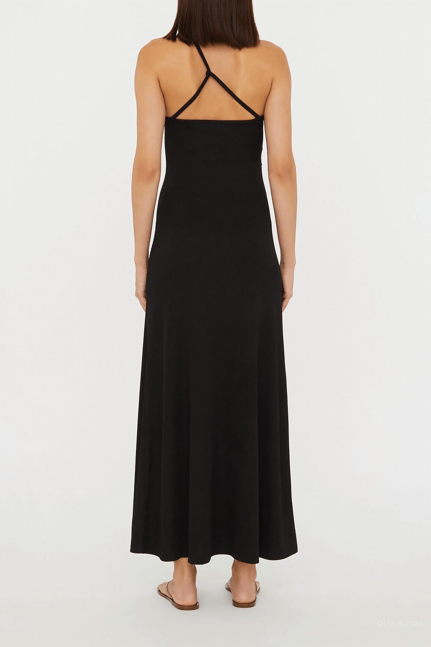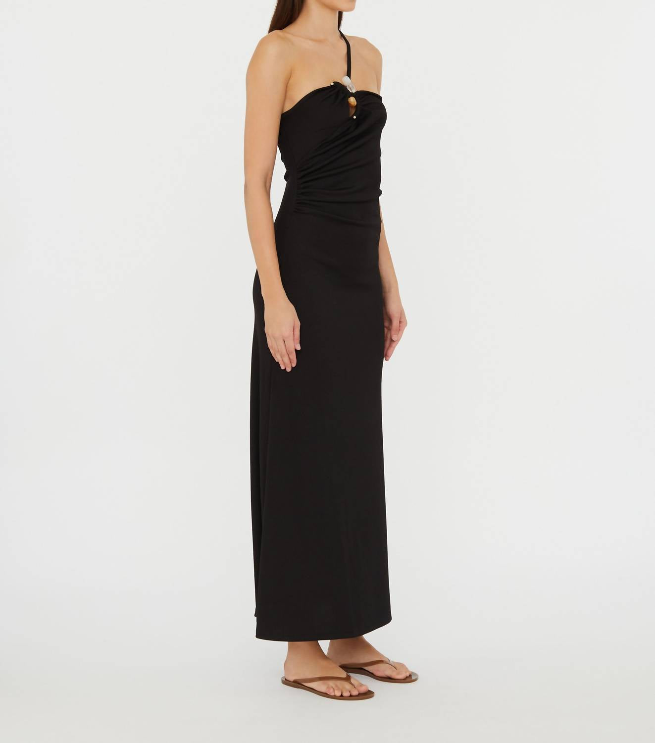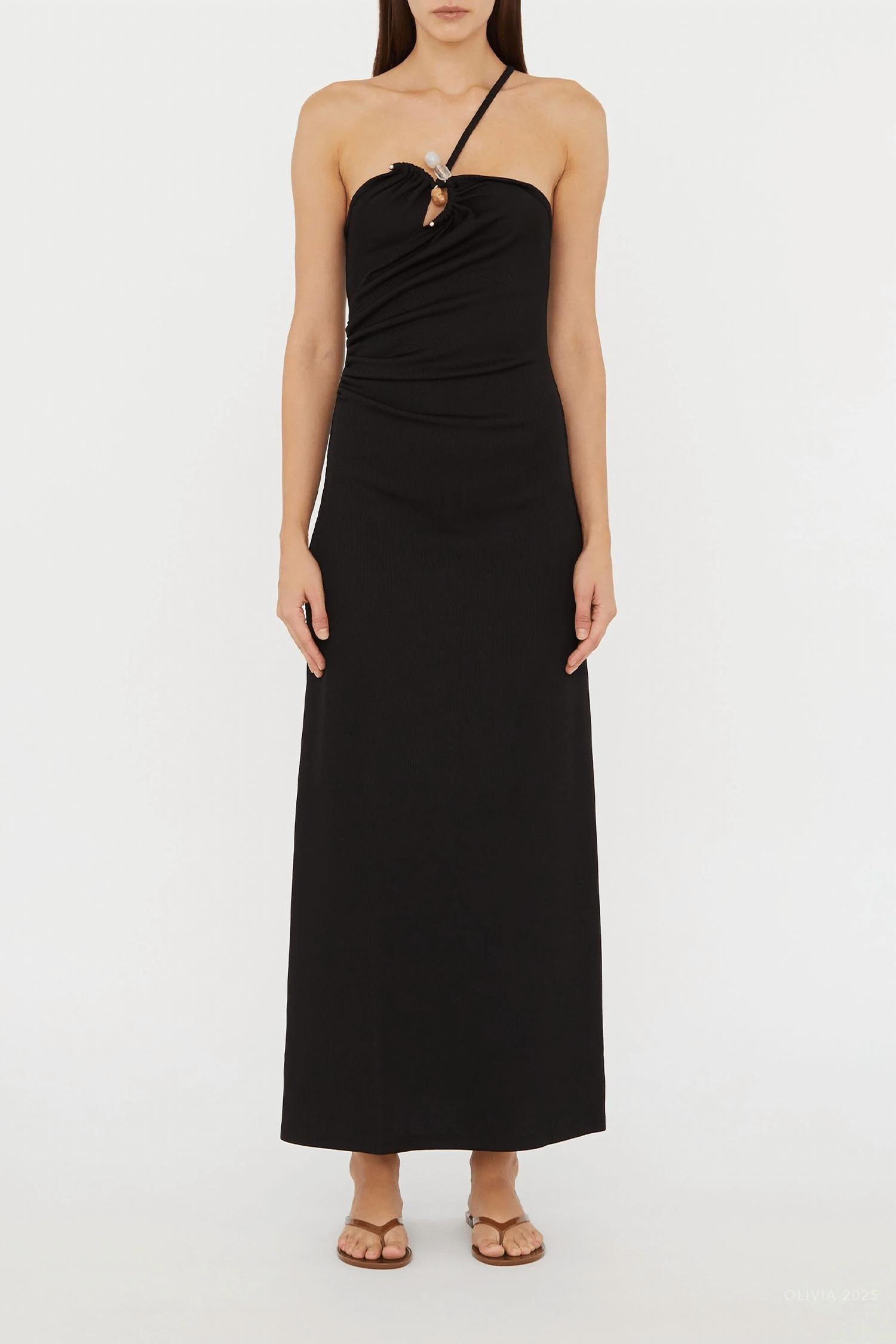 A maxi dress that is just as cute as it is comfortable. Elevate your style with the Concave Stone Cami Dress by Christopher Esber, a sophisticated black maxi dress featuring sleek spaghetti straps for a delicate look. Expertly crafted in Vietnam from a blend of 96% Polyester and 4% Spandex, the dress seamlessly combines elegance with comfort. The pull-on design is adorned with sculptural hardware beautifully incorporating 100% Natural Stones, each with unique enhancing properties. Perfect for a beach day or resort getaway, this dress offers easy wear with a gently flared hem and a straight neckline, and requires dry cleaning.