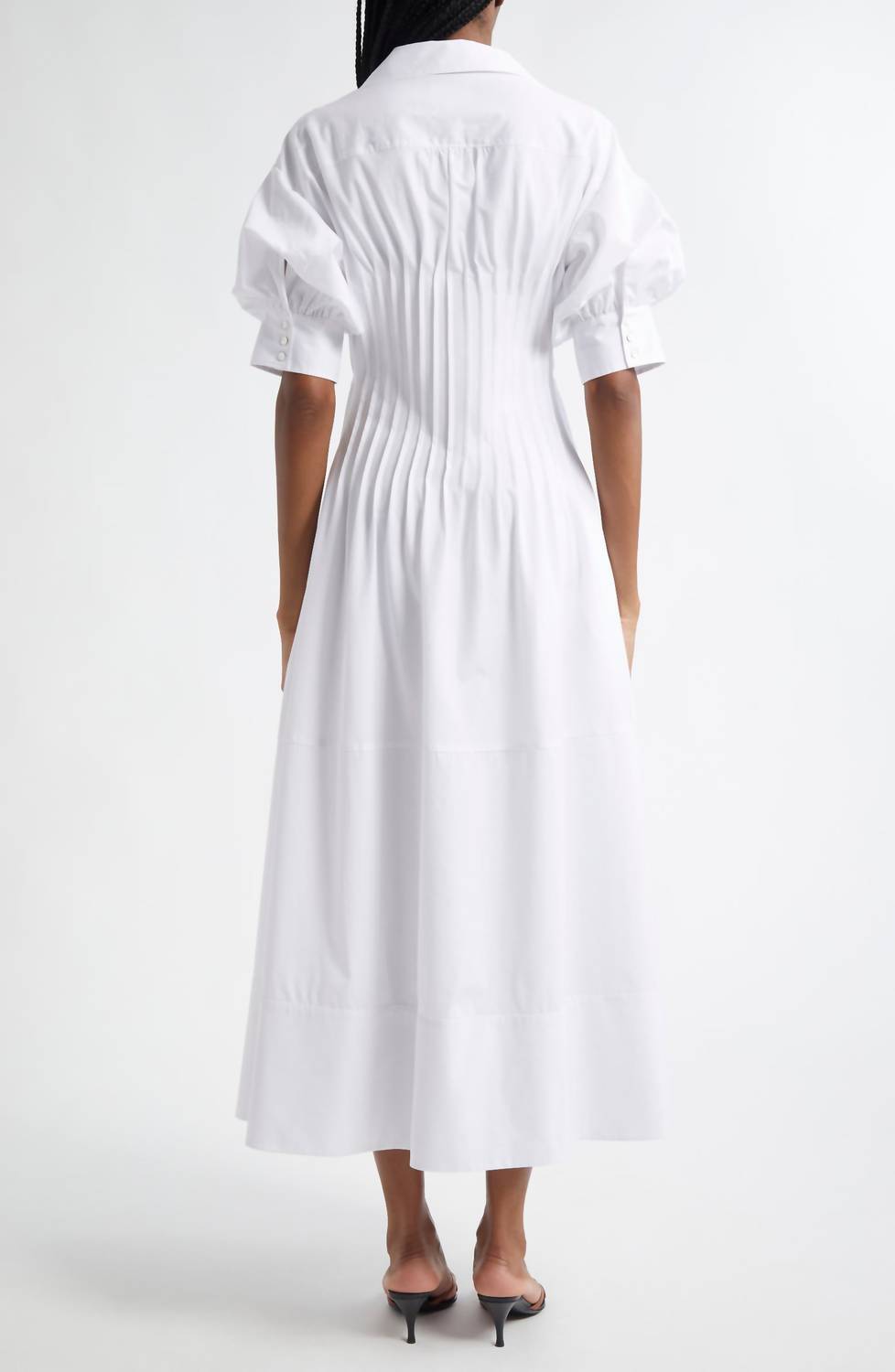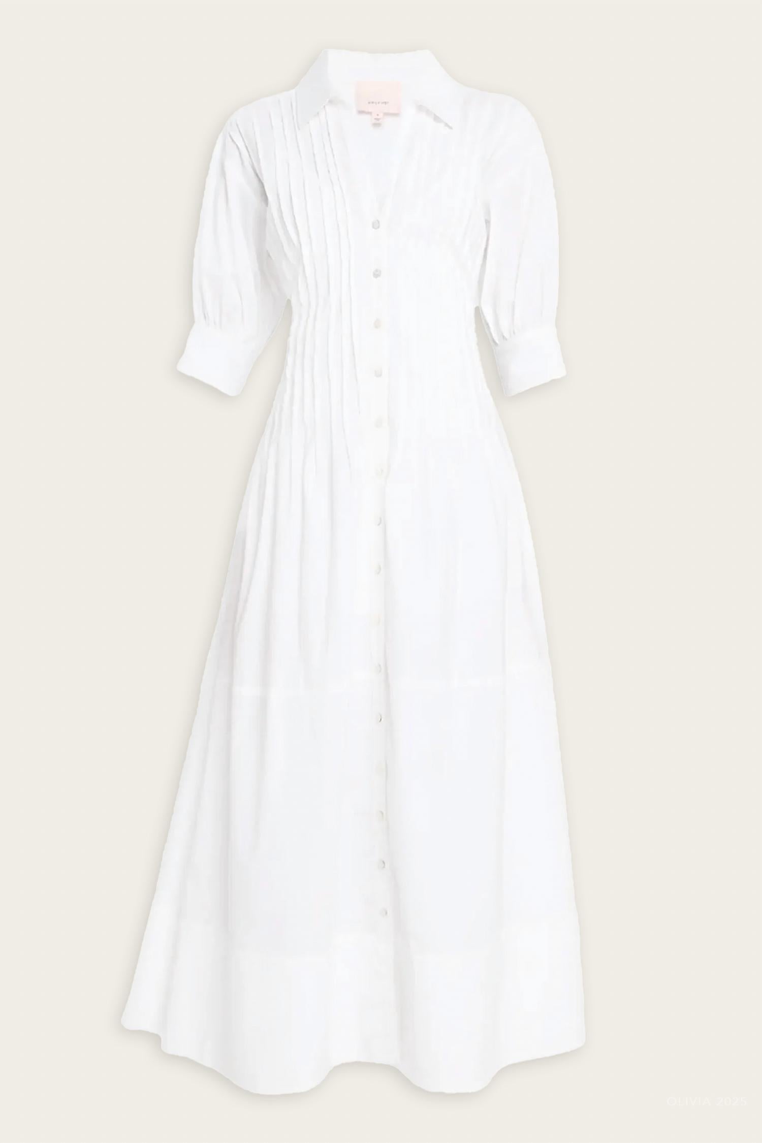 Introducing the Monty Dress by Cinq à Sept, a sophisticated white midi dress perfect for a vacation setting. With its elegant elbow-length puff sleeves and a flattering shirt silhouette, this dress highlights front button closure and a chic spread collar. Crafted from a cotton blend (68% cotton, 28% nylon, 4% spandex) to ensure comfort, it also features practical side-seam pockets. This imported piece requires dry cleaning for care.