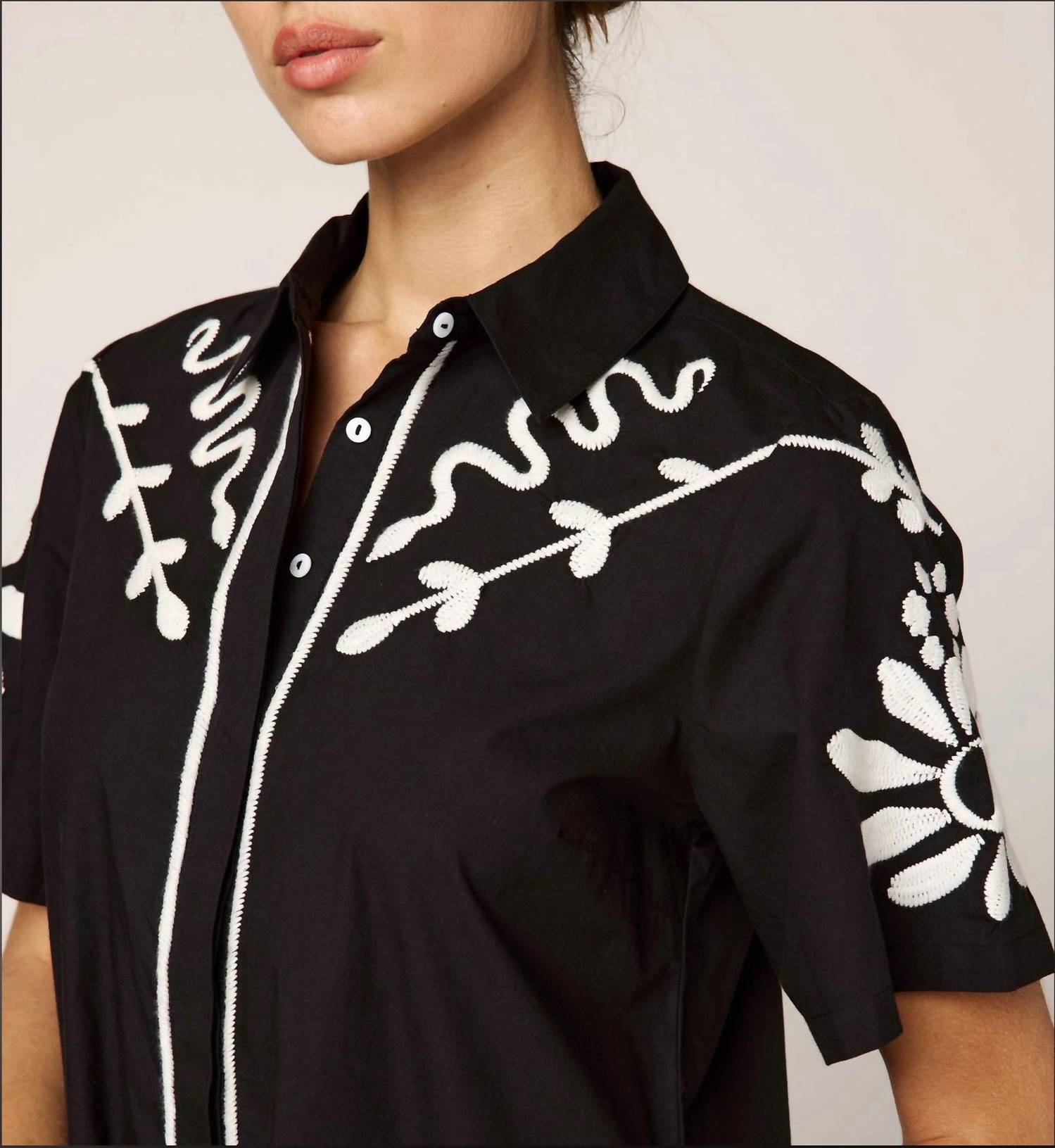 The perfect mini dress for those warmer months. Discover effortless style with the Women's Riya Mini Dress by Cleobella, featuring short sleeves and crafted from GOTS-certified organic cotton poplin. This 33.75-inch dress is ethically handmade in India, showcasing a relaxed, button-down silhouette with a structured collar and intricate white embroidery on rich black fabric. Closure: Button closure. Care: Hand wash and lay flat to dry.