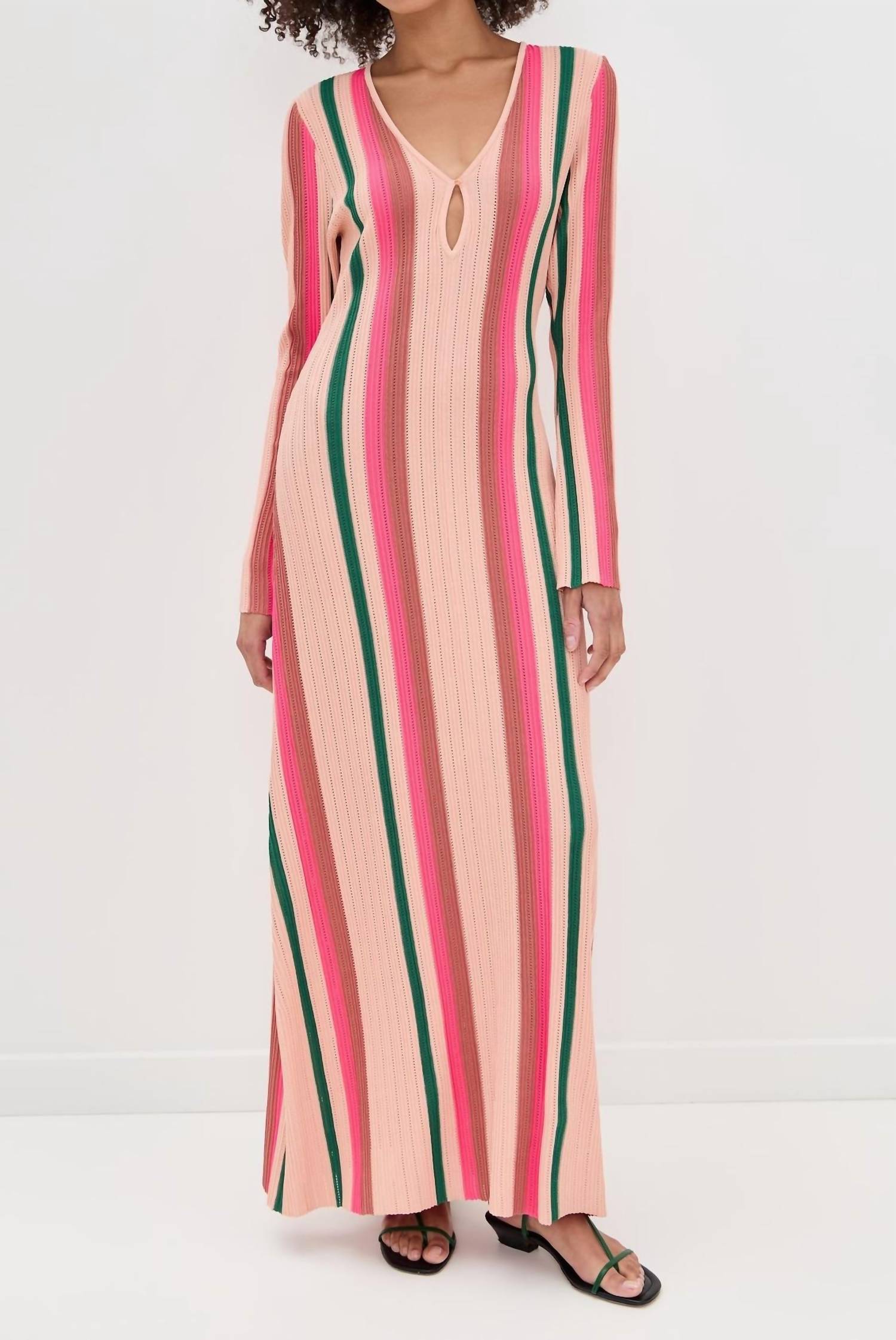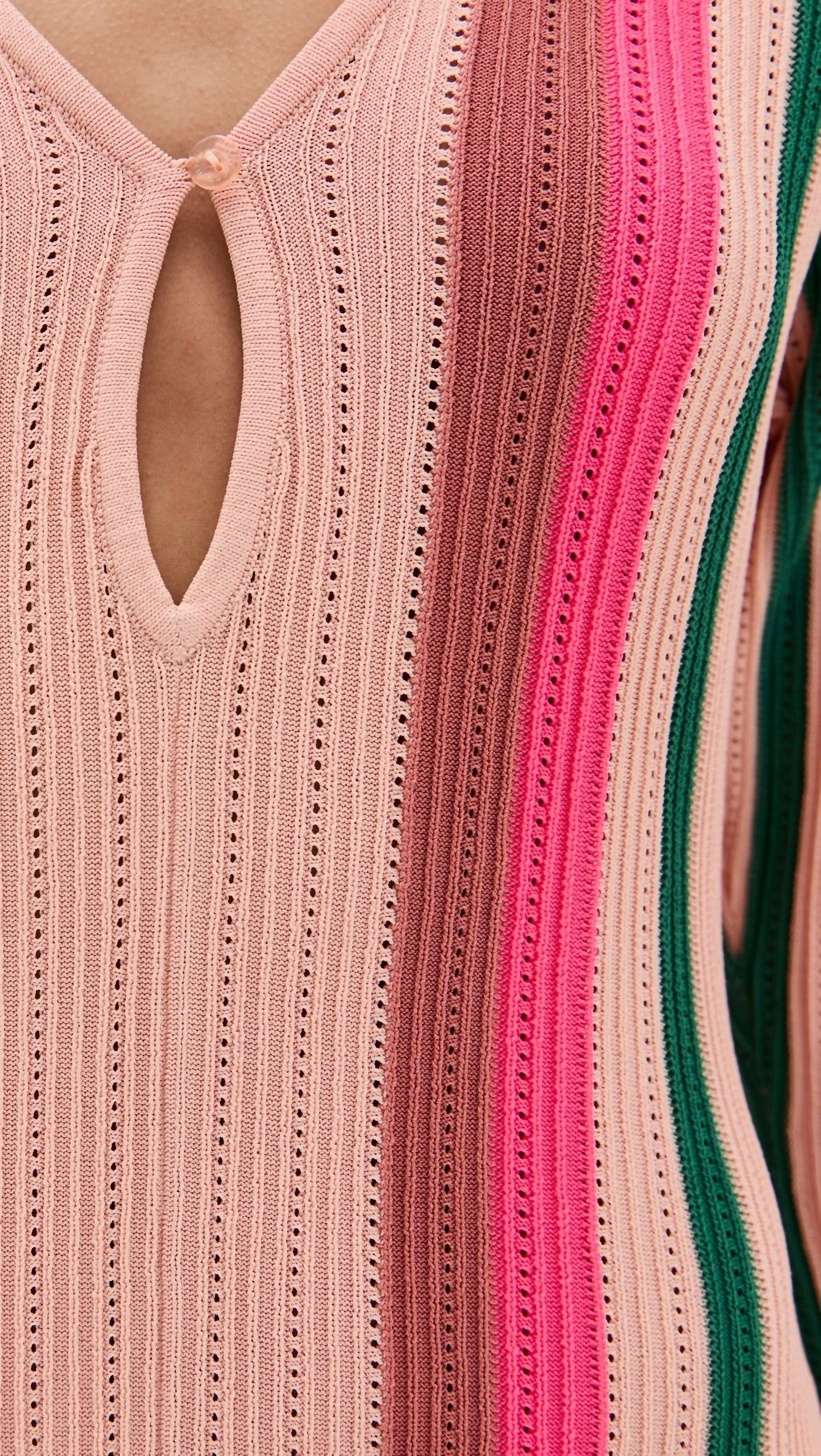 A maxi dress that is just as cute as it is comfortable. The Hiscape Knitted Dress by ESSENTIAL ANTWERP offers a chic and stylish option with its maxi length of 56.25 inches. This combo piece in Nude Hazelnut features long sleeves and a striking striped pattern, complete with a keyhole cutout at the front for an added touch of sophistication. Crafted from a mid-weight, super-stretch knit, it consists of 58% polyester and 42% viscose, ensuring a comfortable fit. With a pull-on closure, this dress is imported from China and requires hand washing to maintain its elegant look.
