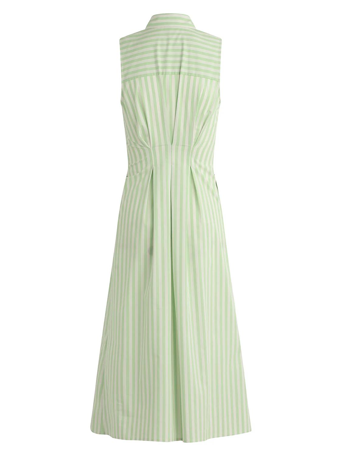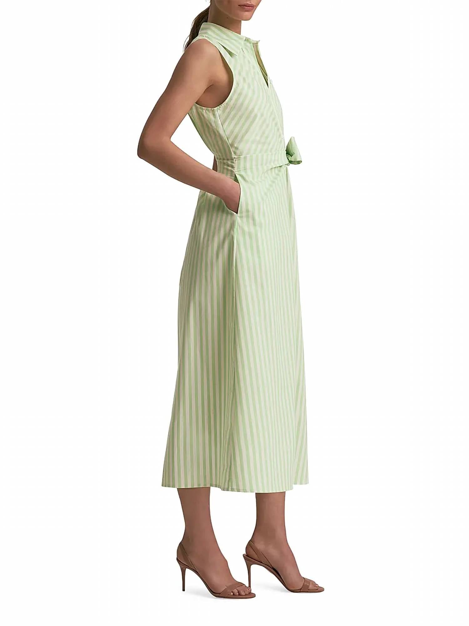 Embrace timeless style with the Good Behavior Button-front Midi-dress by Favorite Daughter in Kiwi Ivory Stripe. This sleeveless dress, crafted from a 61% cotton, 34% polyester, and 5% elastane blend, offers a relaxed silhouette with an easy self-tie waist and side slip pockets. Measuring about 48 inches from shoulder to hem, it features a flattering A-line cut, perfect for both casual and dressier occasions. Imported and designed with a button closure, simply hand wash and dry as instructed to maintain its crisp look. Model is wearing a US size 4 and stands 5'10" tall.