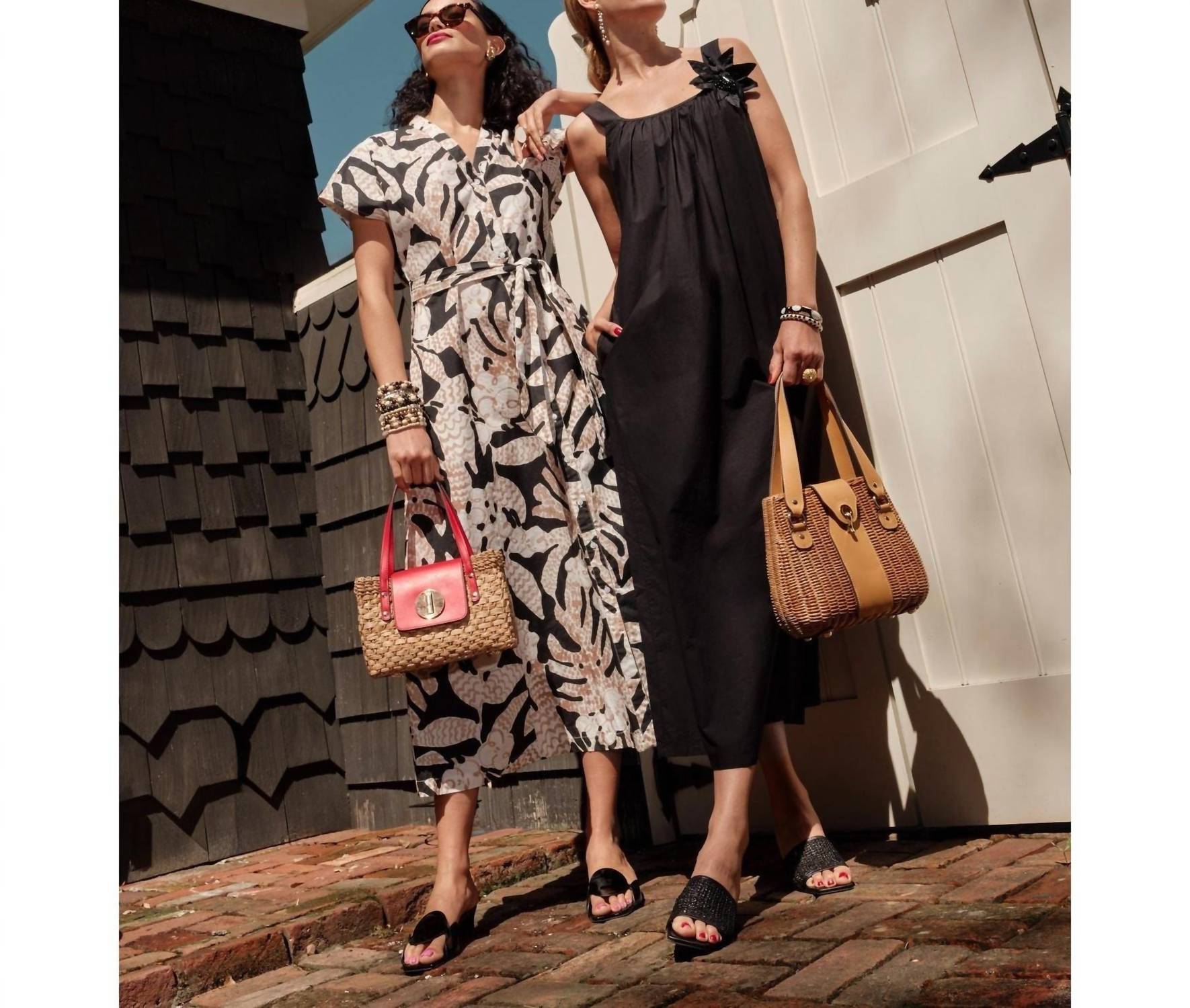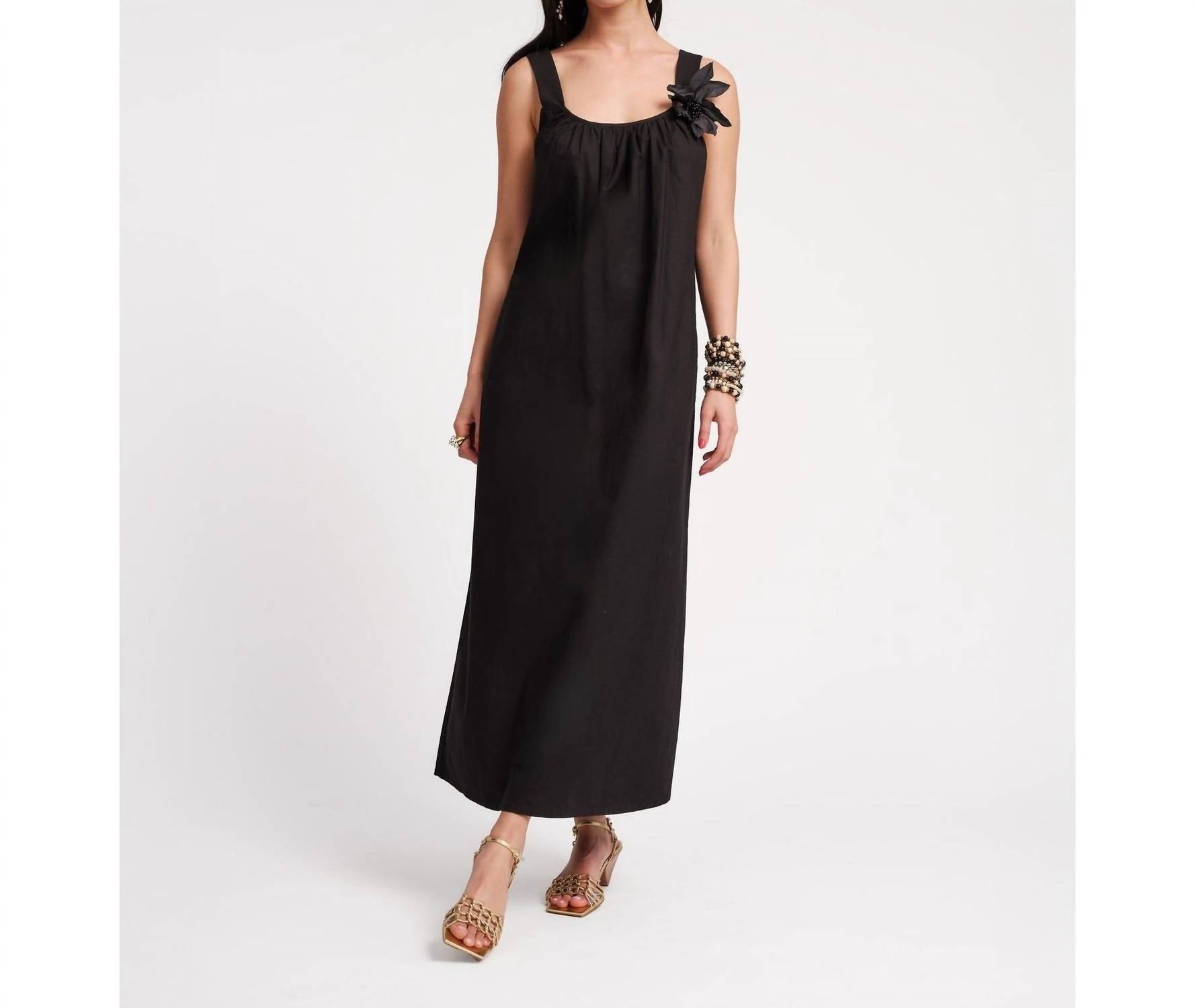 A maxi dress that is just as cute as it is comfortable. Discover the Lynda Maxi Dress by FRANCES VALENTINE, a timeless piece perfect for any stylish summer event. This sleeveless A-line beauty is crafted from crisp cotton, featuring a scoop neckline with gentle ruching and adjustable straps for a personalized fit. It includes a charming detachable floral brooch, adding a playful touch to the minimalist black design. Originating from India, this pull-on dress flaunts a graceful silhouette with dimensions ranging from X-Small to 3X.