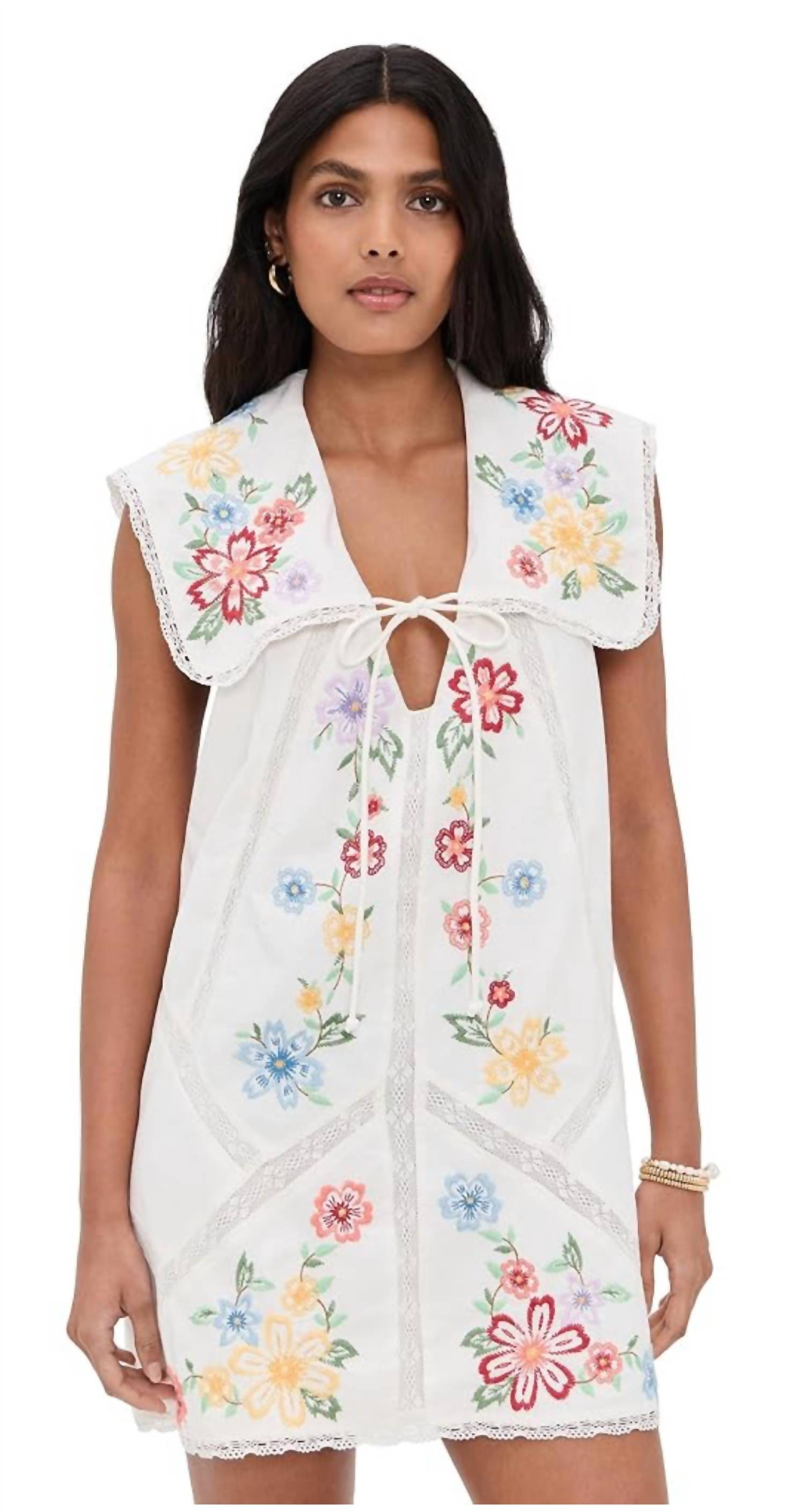 This sleeveless mini dress has an A-line fit and measures 32 inches in bust and 32.5 inches in length for size small. It features a V-neckline, exaggerated collar, lace trim, and a tie detail at the bust. The dress is made of 100% cotton with lace trim, lined with 100% rayon, and has modal trim. It is pull-on style and hand washable in cold water.