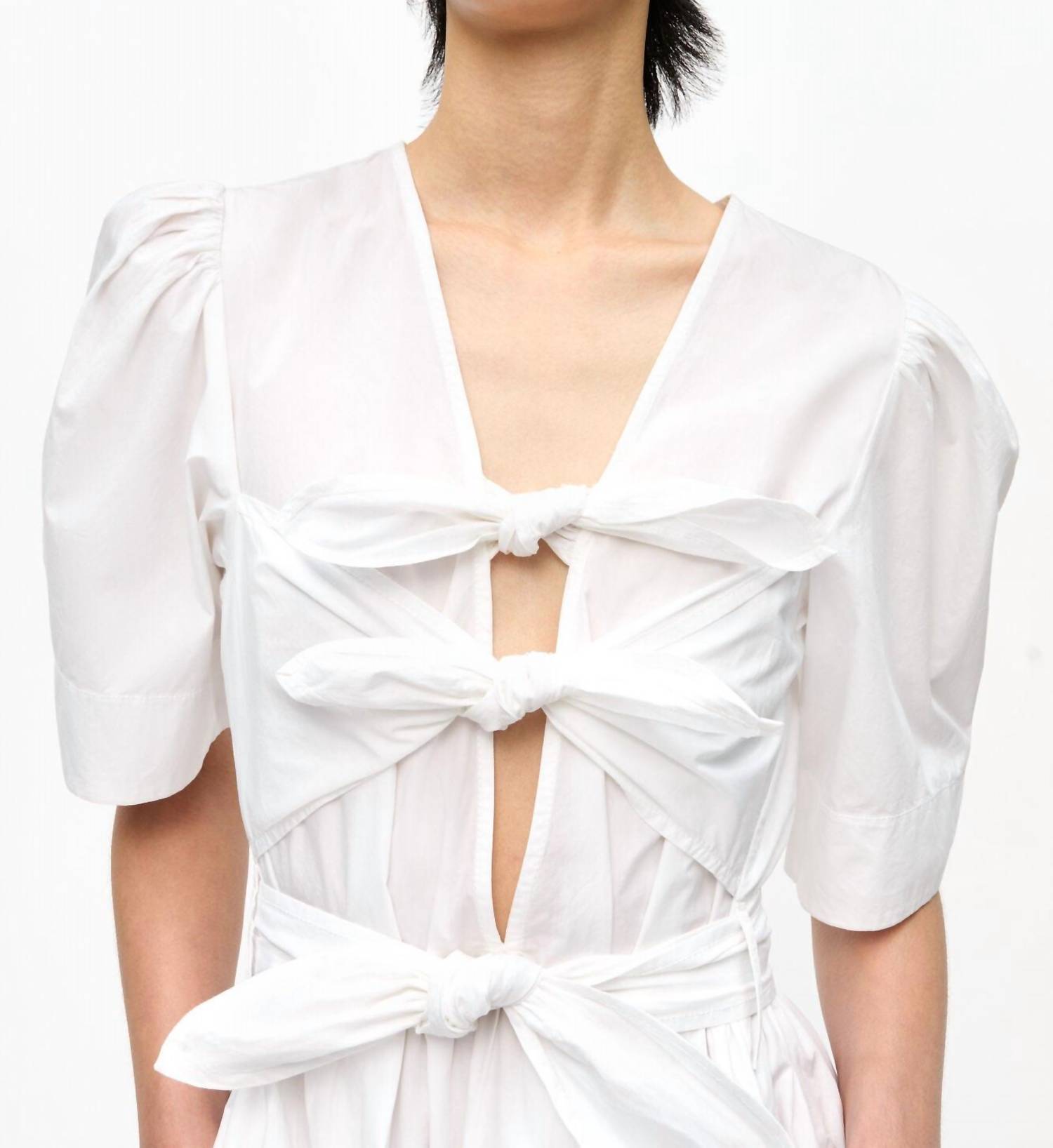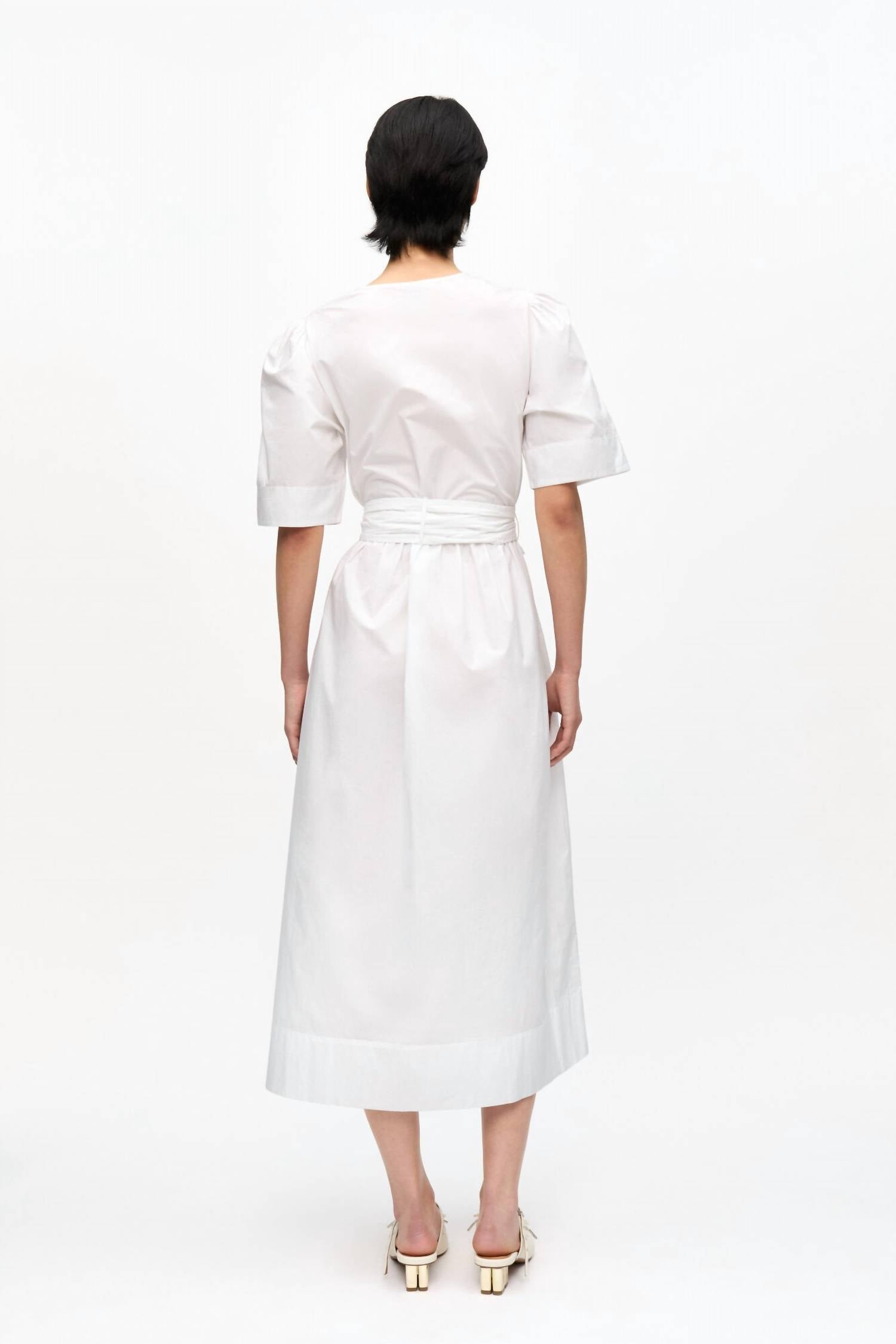 The perfect length dress does exist. Elevate your vacation wardrobe with the Women's Washed Stretch Cotton Tie Strap Midi Dress by GANNI, crafted in a breathable stretch blend of 97% organic cotton and 3% elastane. This dress boasts short, puffed sleeves, a shift dress silhouette, and a stylish deep V-neckline, complete with three front tie bands and handy side pockets. Designed in a versatile solid white, the flared skirt and belt loops add to its boho chic appeal. Closure: Pull on. Perfect for embracing the summer in style.