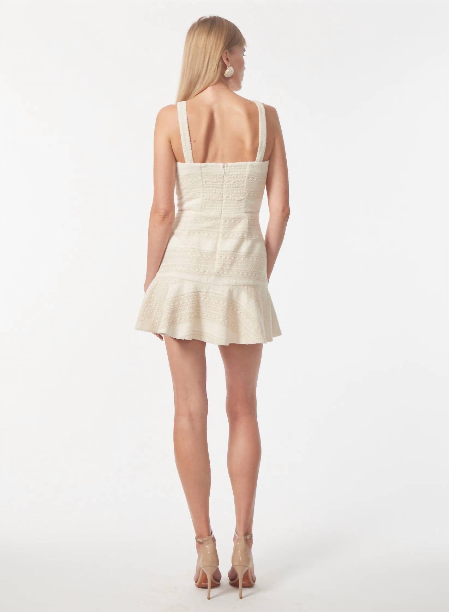 The kind of easy and flattering dress you'll be reaching for all season long. The Julia Mini Dress by GILNER FARRAR is the quintessential summer staple for a touch of quiet luxury. This sleeveless dress in khaki cotton lace showcases a fit-and-flare silhouette with a textured pattern and a fashionable squareneck. Crafted with care, it features adjustable straps, a flared hem, and an easy zip closure. Originating from a sophisticated brand, it demands gentle handling, with care instructions to hand wash the fabric for lasting quality.