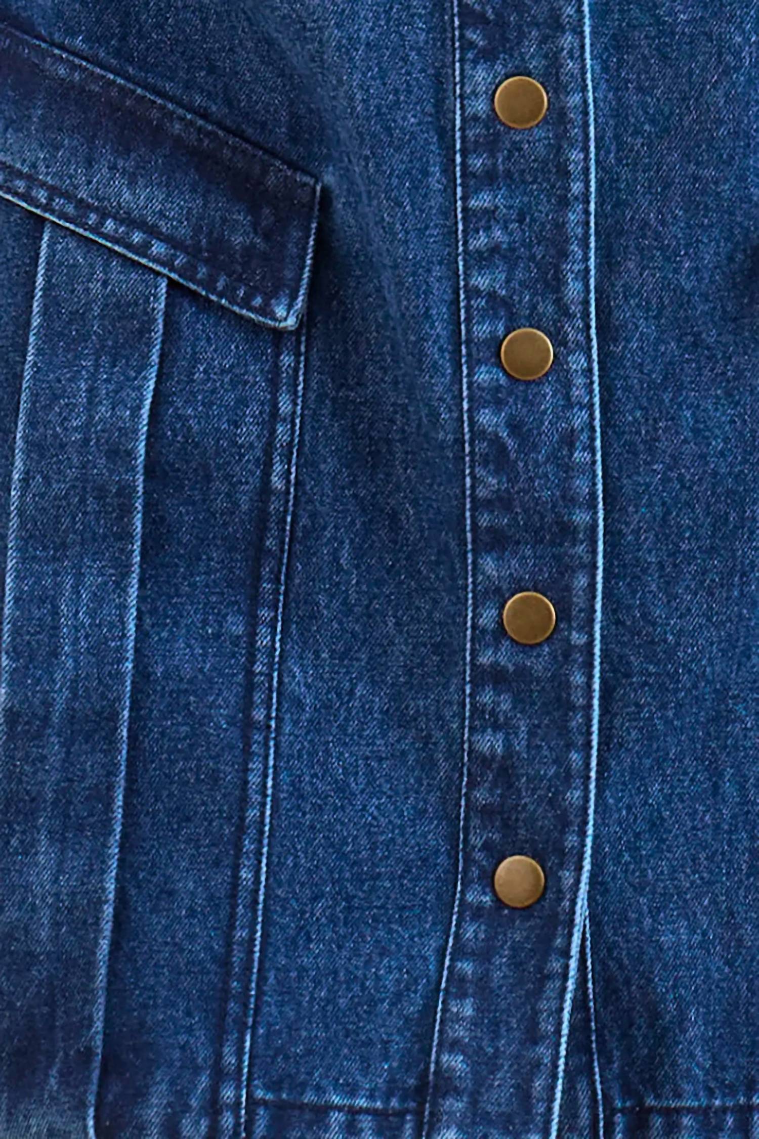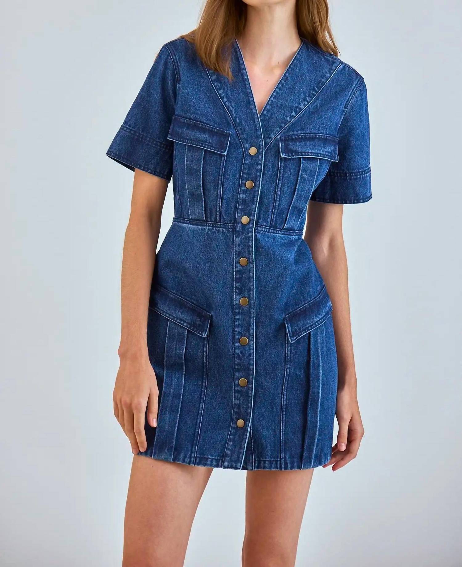 The perfect mini dress for those warmer months. Introducing the Gwen Dress by Hunter Bell, a stylish piece in Harbor Denim designed for effortless wear. This mini dress features short sleeves and a flattering V-neckline, with a sheath silhouette in a solid pattern. Made from cotton, it measures 35 inches from the shoulder and is equipped with a functional snap closure. Machine wash cold. Perfect for a laid-back look with a touch of utility, thanks to its practical chest and skirt pockets. 100% Cotton.