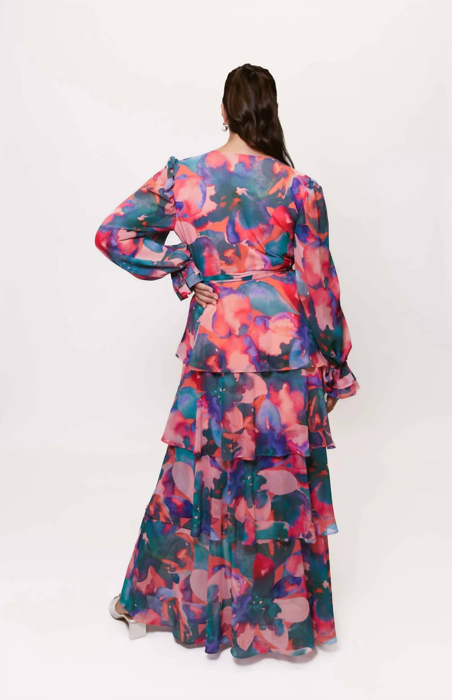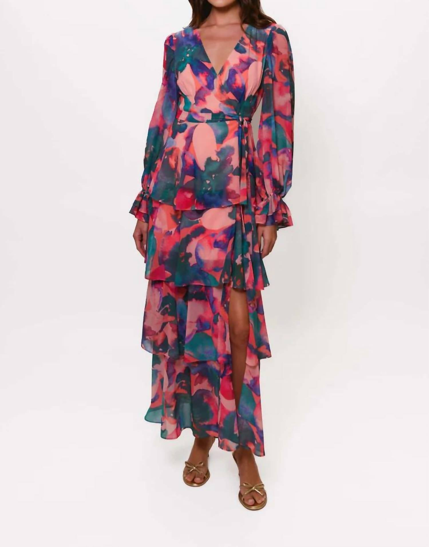 Style this maxi with your favorite statement necklace and sandals for the perfect look. Embrace elegance with the Julia Wrap Dress by Hutch, featuring a captivating Watercolor Abstract Floral design. This long sleeve maxi dress is crafted with a delicate chiffon material and showcases a tiered skirt, enhanced by elastic wrists for a graceful silhouette. Care: Dry clean only. Closure: Pull on. Perfect for a Spring dinner party, this dress embodies the Quiet Luxury trend with its timeless V-neck and wrap silhouette.