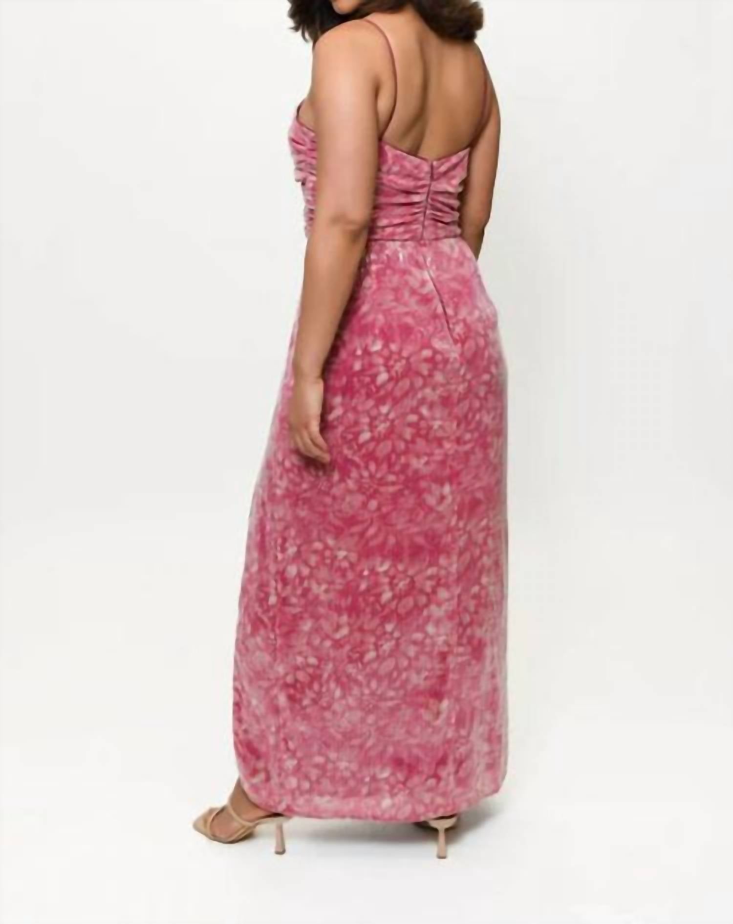 A maxi dress that is just as cute as it is comfortable. Unleash your inner elegance with this luxurious chiffon burnout gown. Designed with a sleeveless scoop neckline, the dress features flattering ruched details along the bodice and skirt to enhance your natural shape. A mid-thigh slit adds a touch of allure, while the full lining ensures comfort and coverage. Finished with a center back zipper and measuring 58" from high point shoulder, this gown is perfect for formal occasions. Dry clean only.