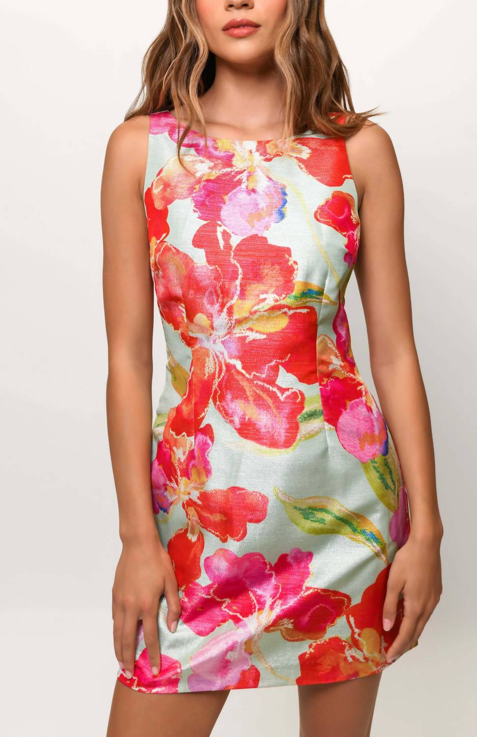 Casual, comfortable and cute! The dress that you'll be reaching for all season long. Unveil your summer style with the Hutch Ren Dress, a boho chic masterpiece in Mint Watercolor Pastel Orchids. This sleeveless shift dress is crafted from 87% Polyester and 13% Metallic, featuring a scoopneck for a relaxed yet elegant look. The zip closure ensures easy wearability, making it perfect for dinner parties and Valentine's Day celebrations. Care: Dry clean or hand wash cold.