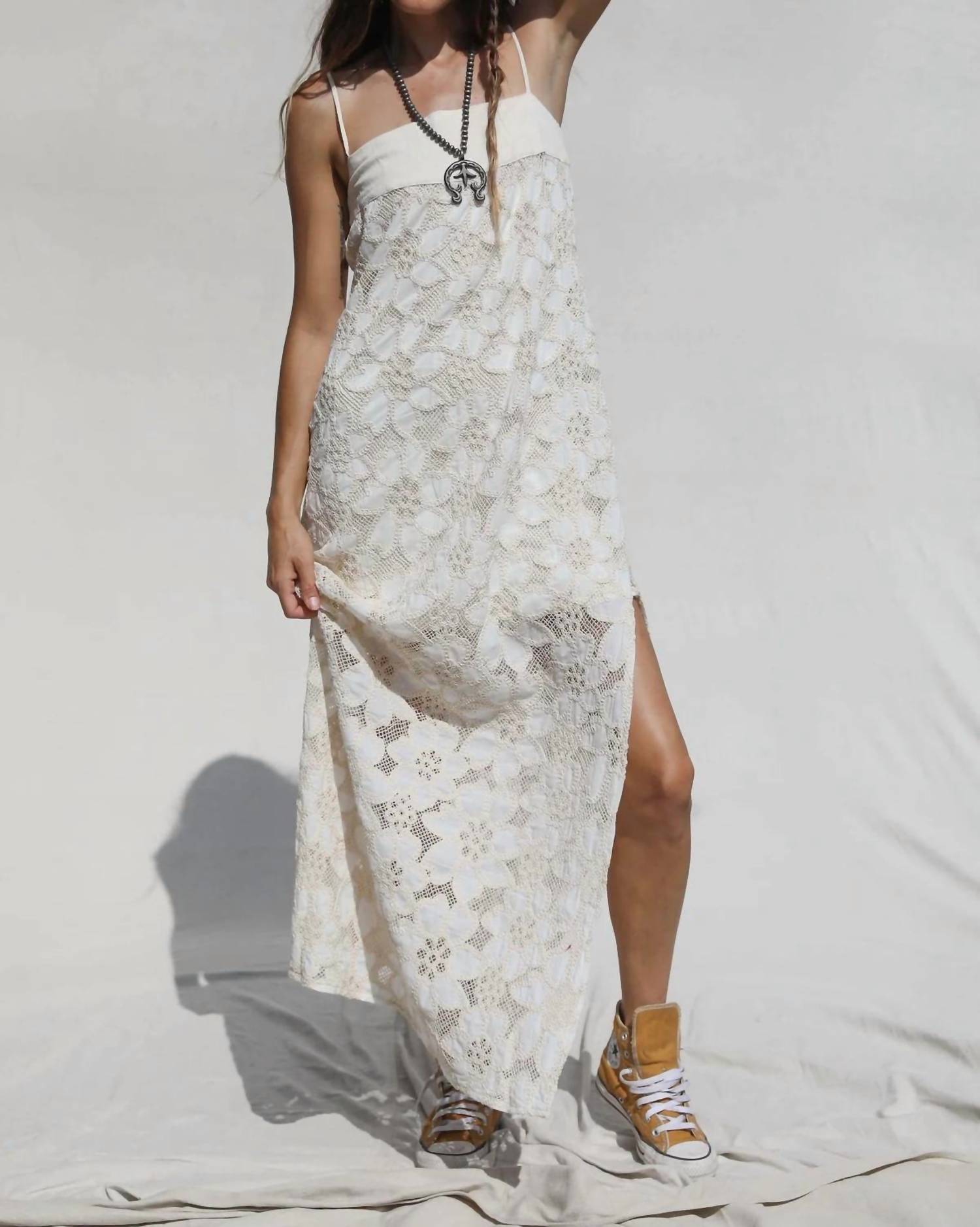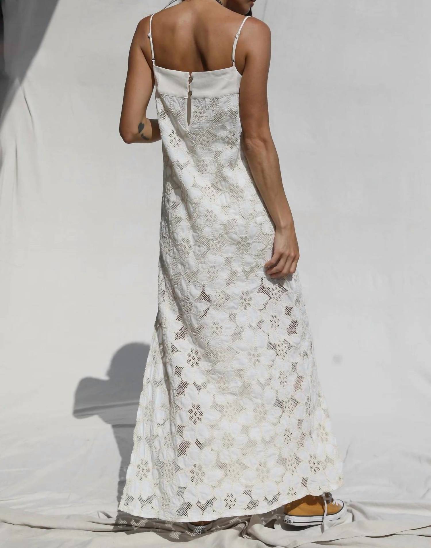 Who doesn't love a good maxi dress? This one you'll be reaching for season after season. Introducing the Lounge Maxi Dress by Jen's Pirate Booty, an ideal choice for beach brides seeking effortless elegance. This A-line dress features spaghetti straps and is crafted from 100% cotton with a beautifully handcrafted embroidered floral design, accented by a functional side slit. The dress includes a square neck and is fully lined for comfort and coverage. Closure: Button closure. Perfect for a minimalist summer occasion.