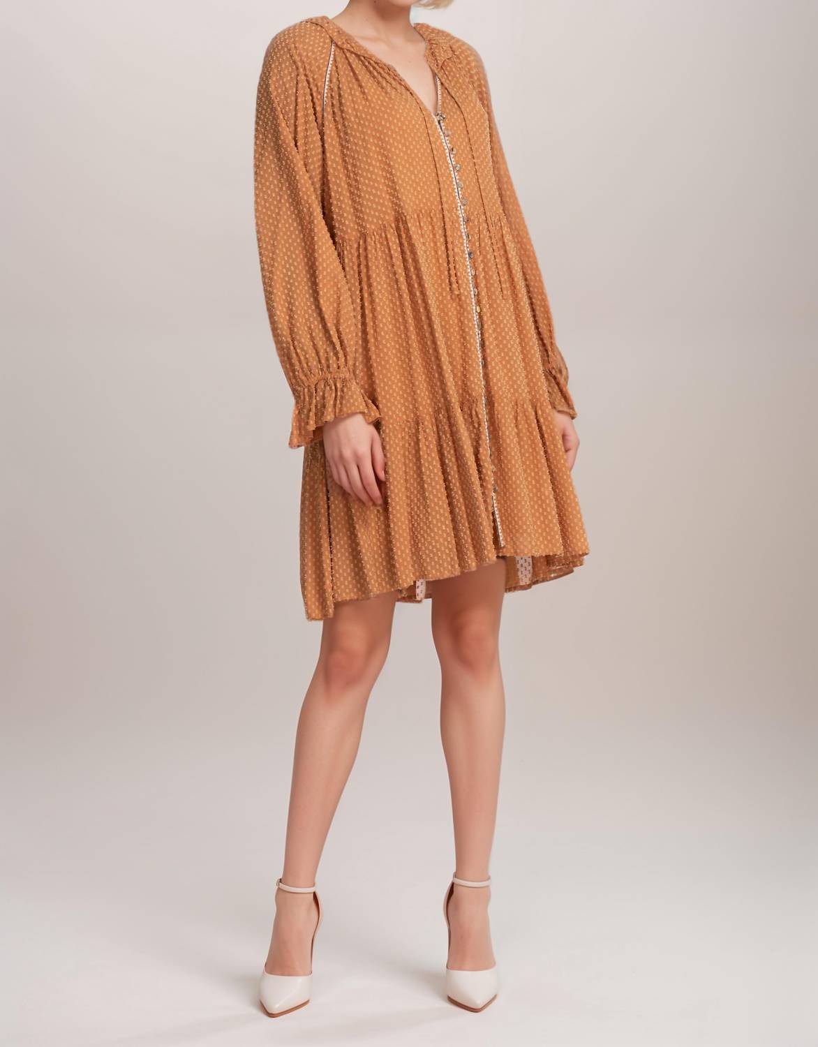 The kind of easy and flattering dress you'll be reaching for all season long. The Johnny Was Jade Orla Mini Dress exudes a boho-chic vibe with its elegant design and subtle patterns in Margo color. Featuring long raglan sleeves and crafted from a comfortable blend of 84% Viscose, 15% Cotton, and 1% Spandex, this dress is a summer must-have. Its two-tiered ruffles and shift silhouette add movement and flair, while the button closure enhances its relaxed style. Originating from a commitment to unique prints and patterns, this dress requires dry clean care to maintain its intricate design.