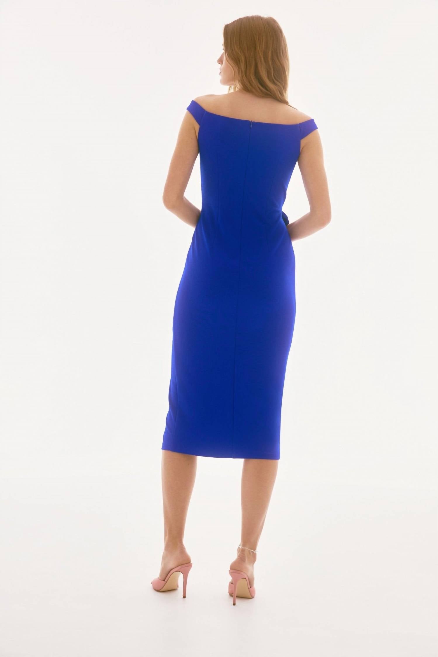 A midi dress so versatile, your options for wearing it are endless. Experience the elegance of the Belted Bodycon Dress by Joseph Ribkoff, a stunning piece merging sophistication with contemporary style. This Canadian-made short sleeve dress, composed of 95% polyester and 5% spandex, features a flattering knee-length silhouette with an eye-catching belted waist and ruching for added style. A back zip closure ensures a sleek fit, while its solid blue hue embodies timeless elegance. Designed without a lining, it offers an approximate length of 42 inches (107 cm) in size 12, perfect for making a chic statement at any evening event.
