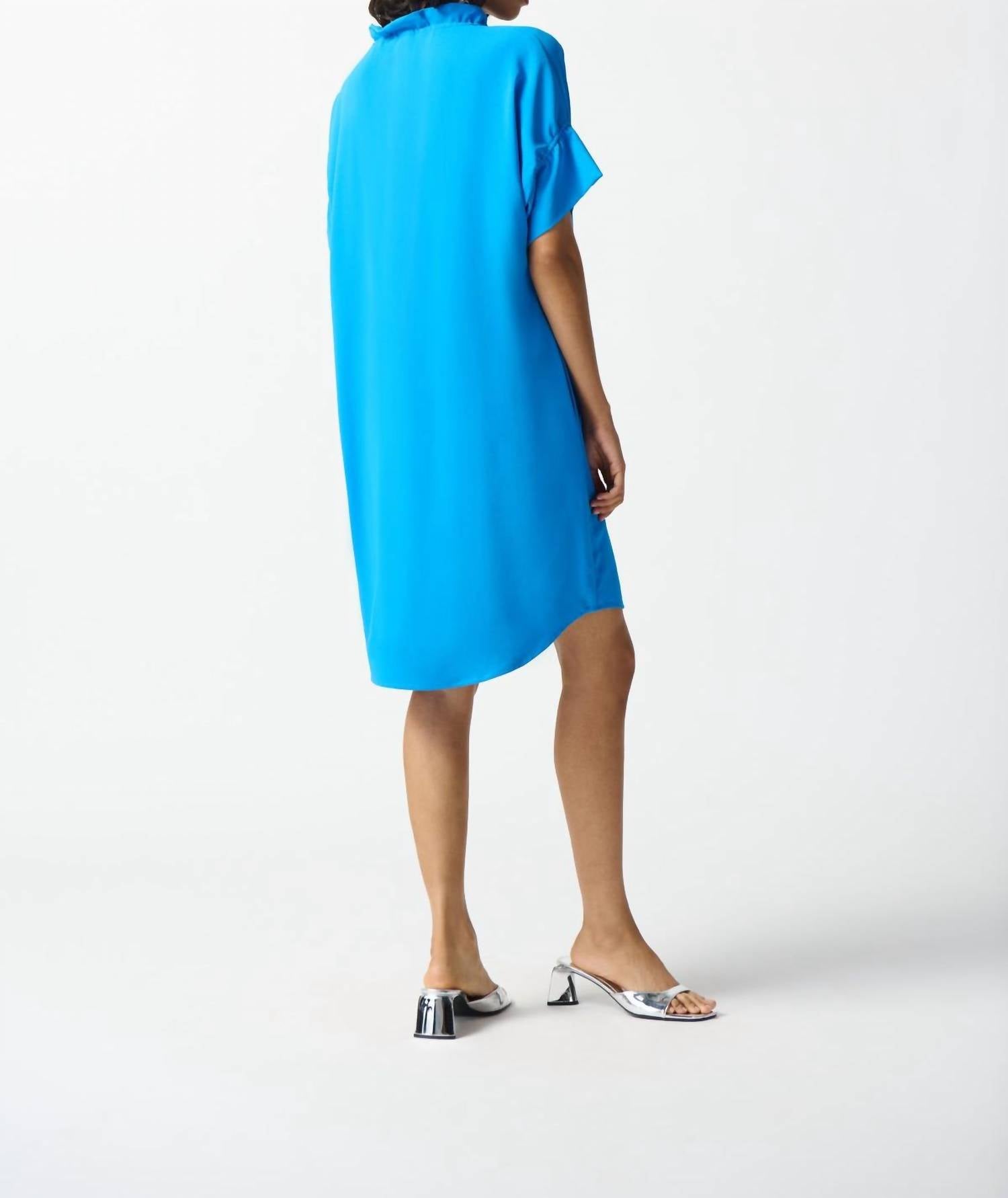 Elevate your wardrobe with the chic Ruffled V-neck Shift Dress by Joseph Ribkoff, expertly crafted in French Blue for a Springtime statement. This dress features short sleeves and a pull-on closure, ensuring easy wear while incorporating elegant ruffles at the v-neckline. Made from 96% polyester and 4% spandex, it offers flexibility and sophistication with its smooth mini shift silhouette. Pockets add functionality to this solid holiday party essential, designed for hand wash and line dry care.