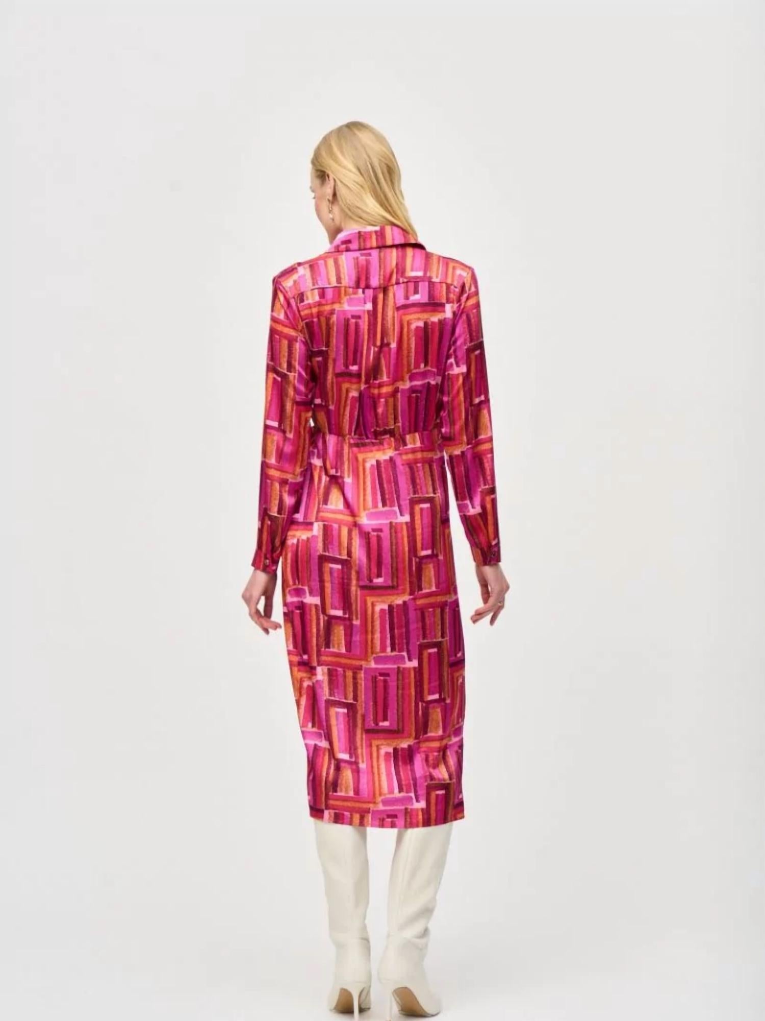Step into sophistication with the Satin Geometric Print Wrap Dress by Joseph Ribkoff, crafted in a stunning pink/multi geometric pattern. With long cuffed sleeves and a shirt collar, this midi silk dress made from a luxurious blend of 95% Polyester and 5% Spandex features a stylish tie closure that accentuates the waist with graceful pleats. Its wrap design echoes elegance with a hint of modern edge thanks to the daring front slit. Care is easy: hand wash in cold water with like colors and hang to dry in the shade. The model stands tall at 5'11" and is wearing a size 6.