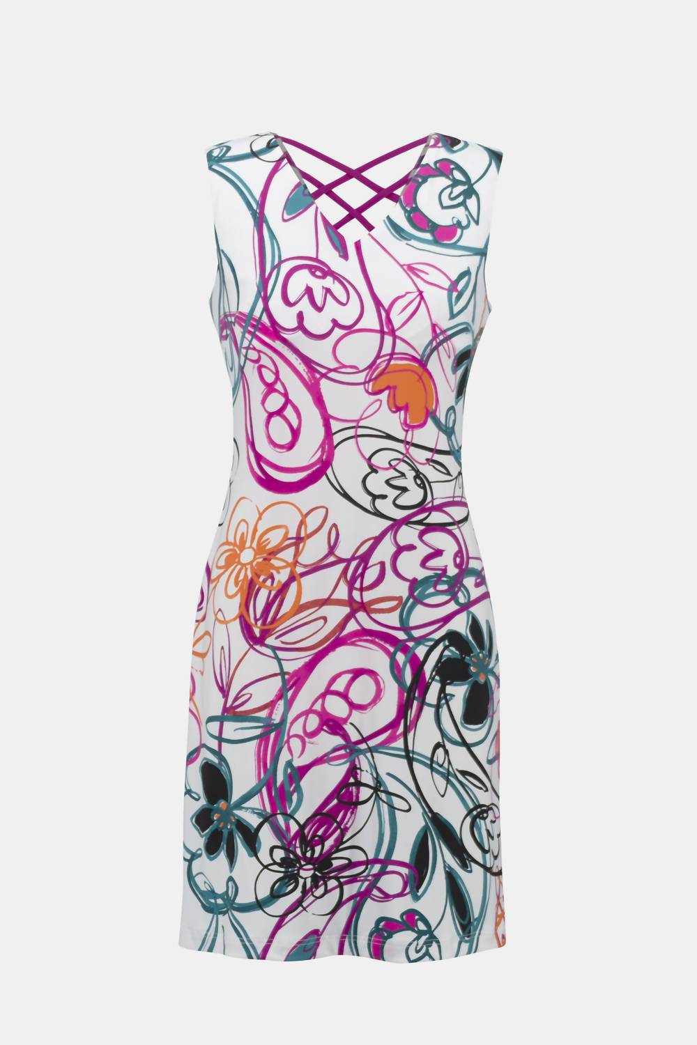 The kind of easy and flattering dress you'll be reaching for all season long. Elevate your wardrobe with the Joseph Ribkoff Scribble Print Sheath Dress, an elegant choice for any holiday party. Featuring a sleeveless design and crafted from 95% Polyester and 5% Spandex, this mini dress in vanilla/multi is made in Canada and offers a flattering V-neckline and unique floral scribble pattern. The 38-inch sheath silhouette provides a contouring fit with a convenient pull-on closure. For easy care, simply hand wash in cold water, hang to dry, and low iron for best results.