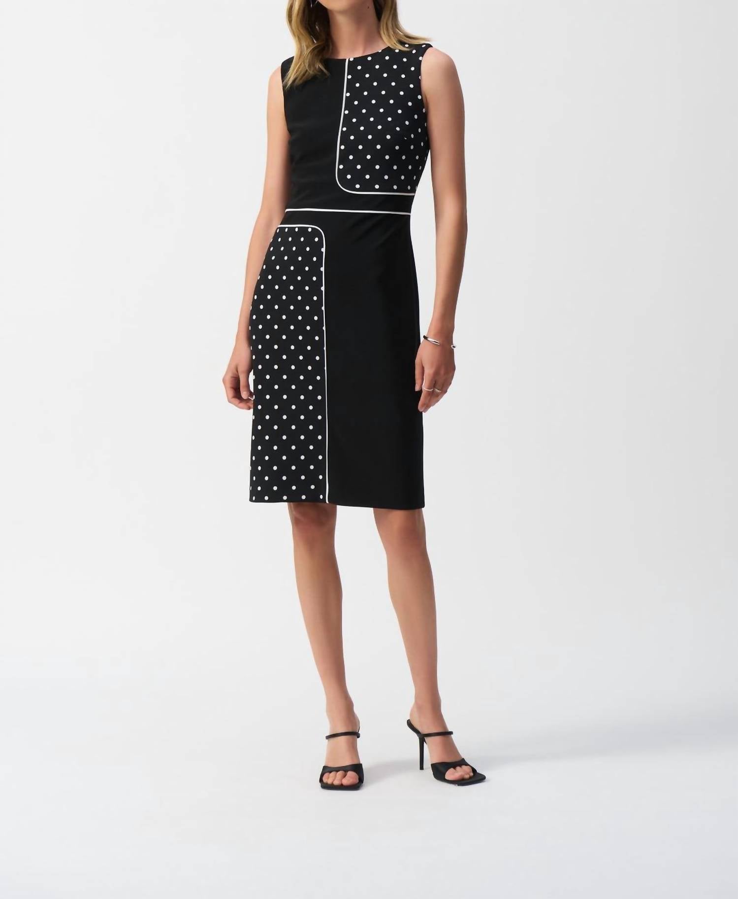 Just add slides or mules and you are good to go. This silky knit dress embodies poise and elegance. Featuring charming dot print inserts with contrast piping across the bust and skirt, it creates an alluring design. The sleek crew neck and sleeveless cut perfectly complement the classic sheath silhouette, enhancing its refined appeal.