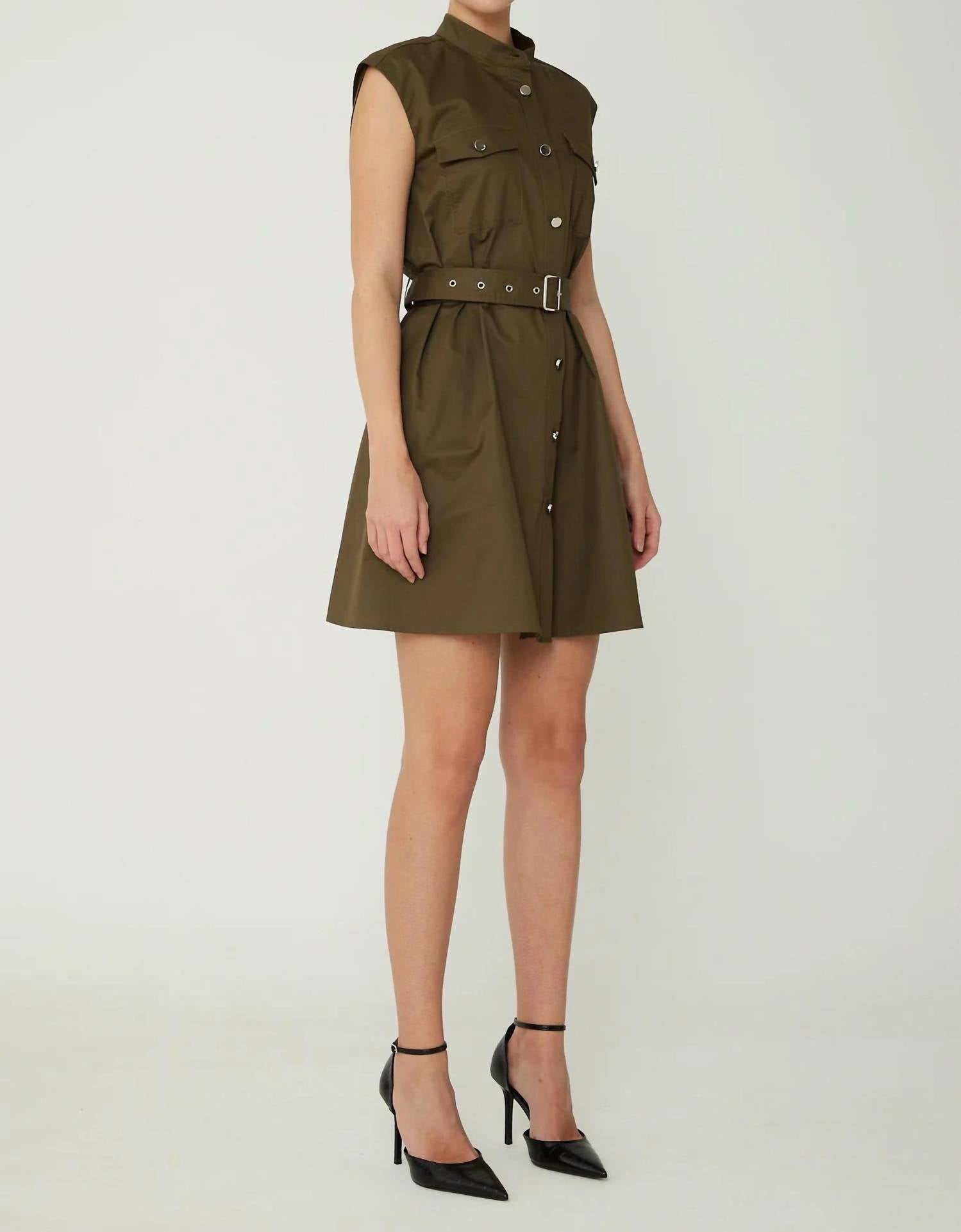 The perfect mini dress for those warmer months. Elevate your wardrobe with the Barbara Mini Dress by JS Boutique, a perfect blend of sporty elegance in a stunning olive shade. This sleeveless, A-line dress features a collar neckline and a utilitarian touch with included pockets and a belt. Crafted from 100% cotton, its unlined, loose fit can be easily adjusted with its front button closure to match any occasion, from dinner parties to casual outings. Care: Dry clean only.