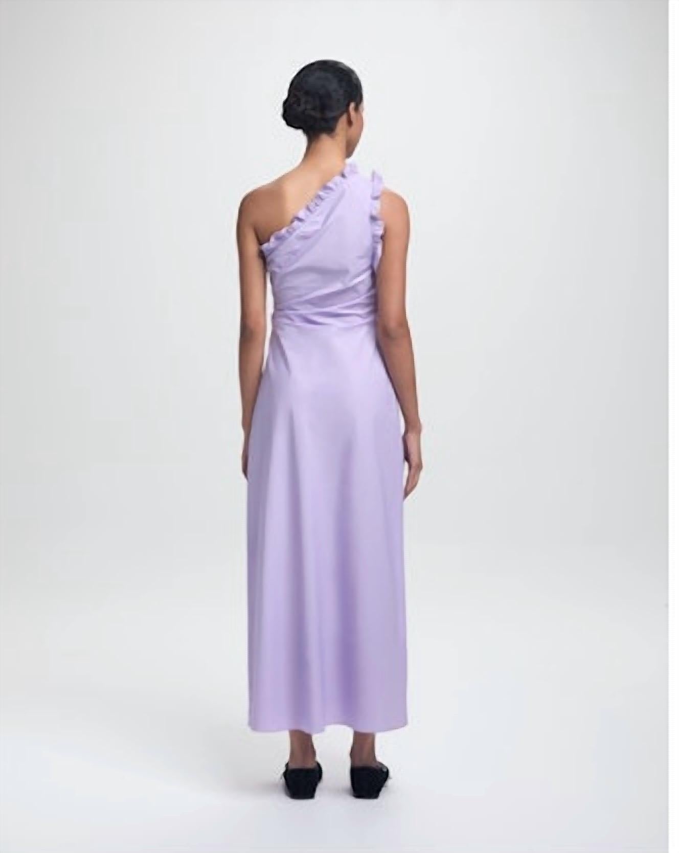 Presenting the Elaine Dress Poplin by Kika Vargas, a stunning lilac piece perfect for spring and vacation occasions. This sleeveless maxi dress, made from 100% Cotton of Colombian origin, showcases an elegant off-the-shoulder neckline and a flattering A-line silhouette. Designed with a solid pattern for a touch of quiet luxury. Care instructions specify dry clean only.