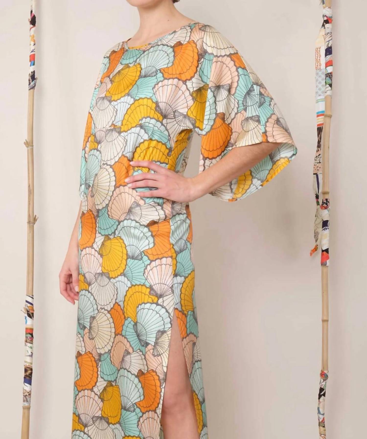 Who doesn't love a good maxi dress? This one you'll be reaching for season after season. Introducing the Midday Maxi Dress by LA PRESTIC OUISTON, an exquisite statement piece for any holiday party. This shift dress features three-quarter length flared sleeves and a boatneck, with a stylish slit on the left side for added flair. Made from 100% Silk in Europe, the dress exhibits the exclusive "ST JACQUES" pattern based on Laurence Kiberlain's drawings. Closure is pull-on and care for this luxurious piece is dry clean only, adding sophistication to your boho chic summer wardrobe.