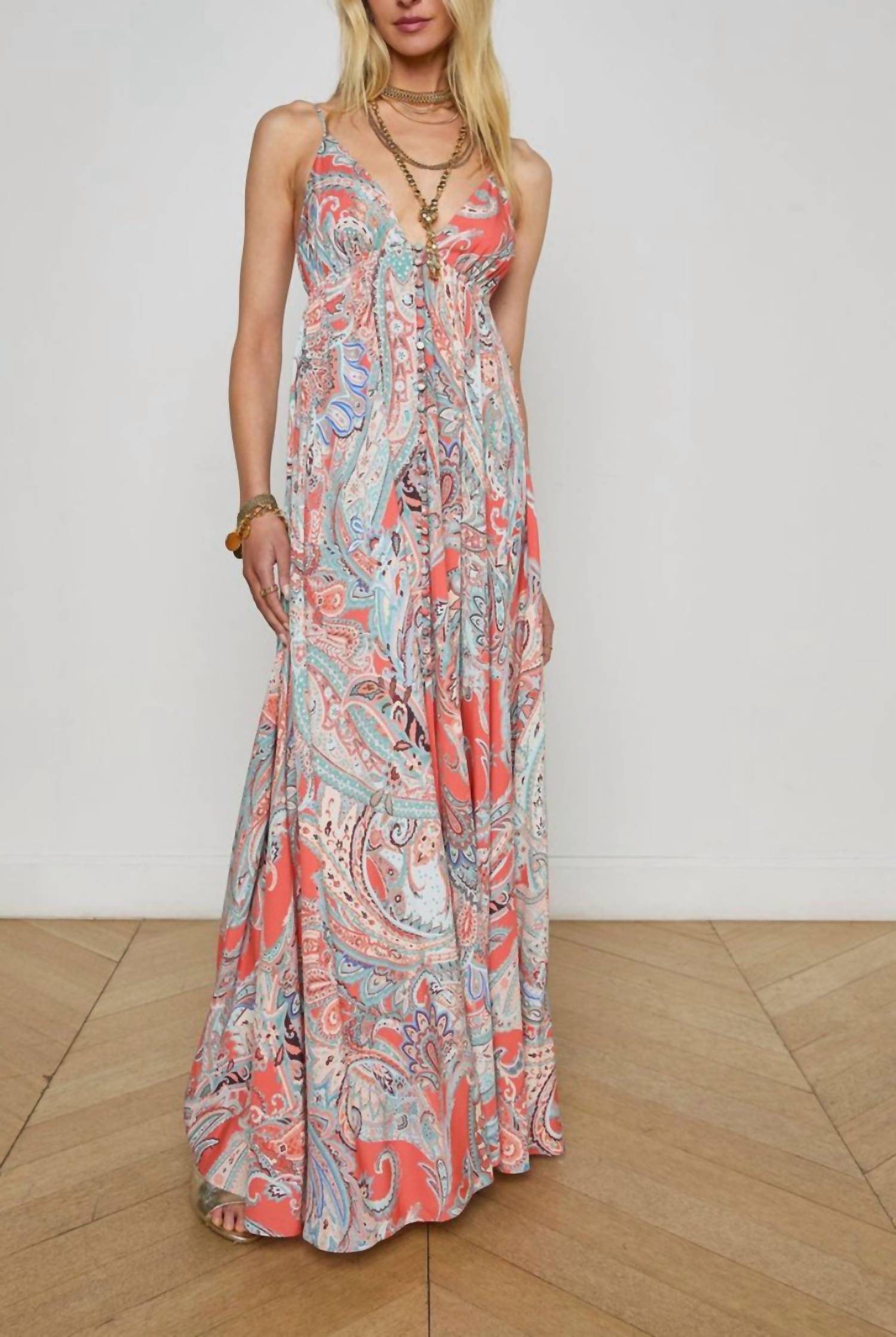A maxi dress that is just as cute as it is comfortable. The L'Agence Women's Stefani Dress is an effortlessly stylish choice for music festivals, featuring a sleeveless and shift silhouette with a chic boho flair. Displaying an eye-catching orange and blue paisley pattern, this maxi dress is designed for vibrant summer days. The dress has a convenient pull-on closure and a flattering V-neckline. Embrace the care-free summer vibes with this patterned piece that's perfect for festival occasions.