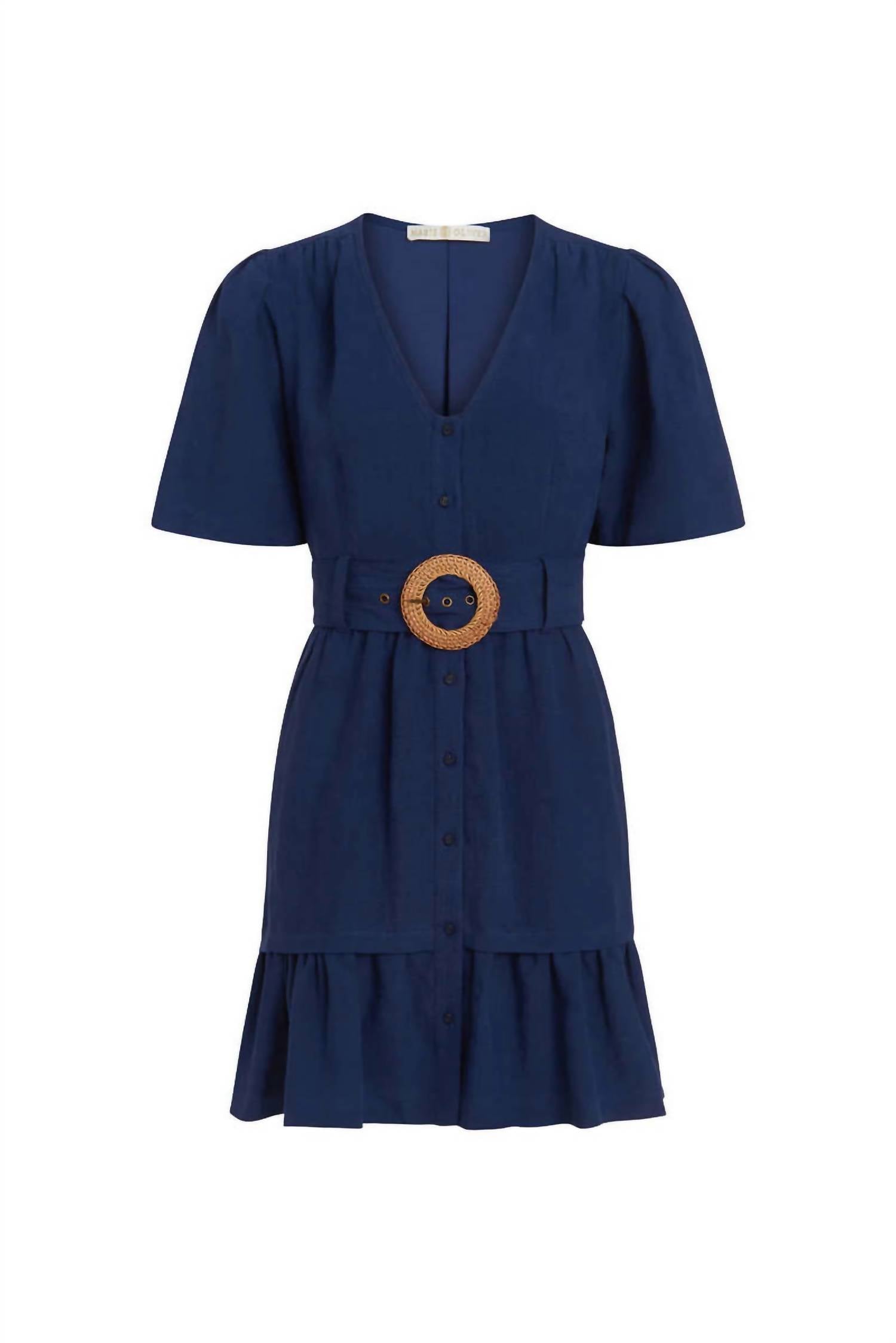 Comfortable and cute, this casual day dress has it all. Experience effortless style with the Gwenyth Dress by Marie Oliver, a versatile A-line silhouette in a sophisticated navy shade. This short-sleeve dress is crafted from a luxurious 55% linen and 45% cotton blend, offering both comfort and elegance. It features a unique button-front placket closure with an optional rattan buckle belt to accentuate your waist. Care: Machine wash cold with like colors on a gentle cycle and lay flat to dry or dry clean for best results.
