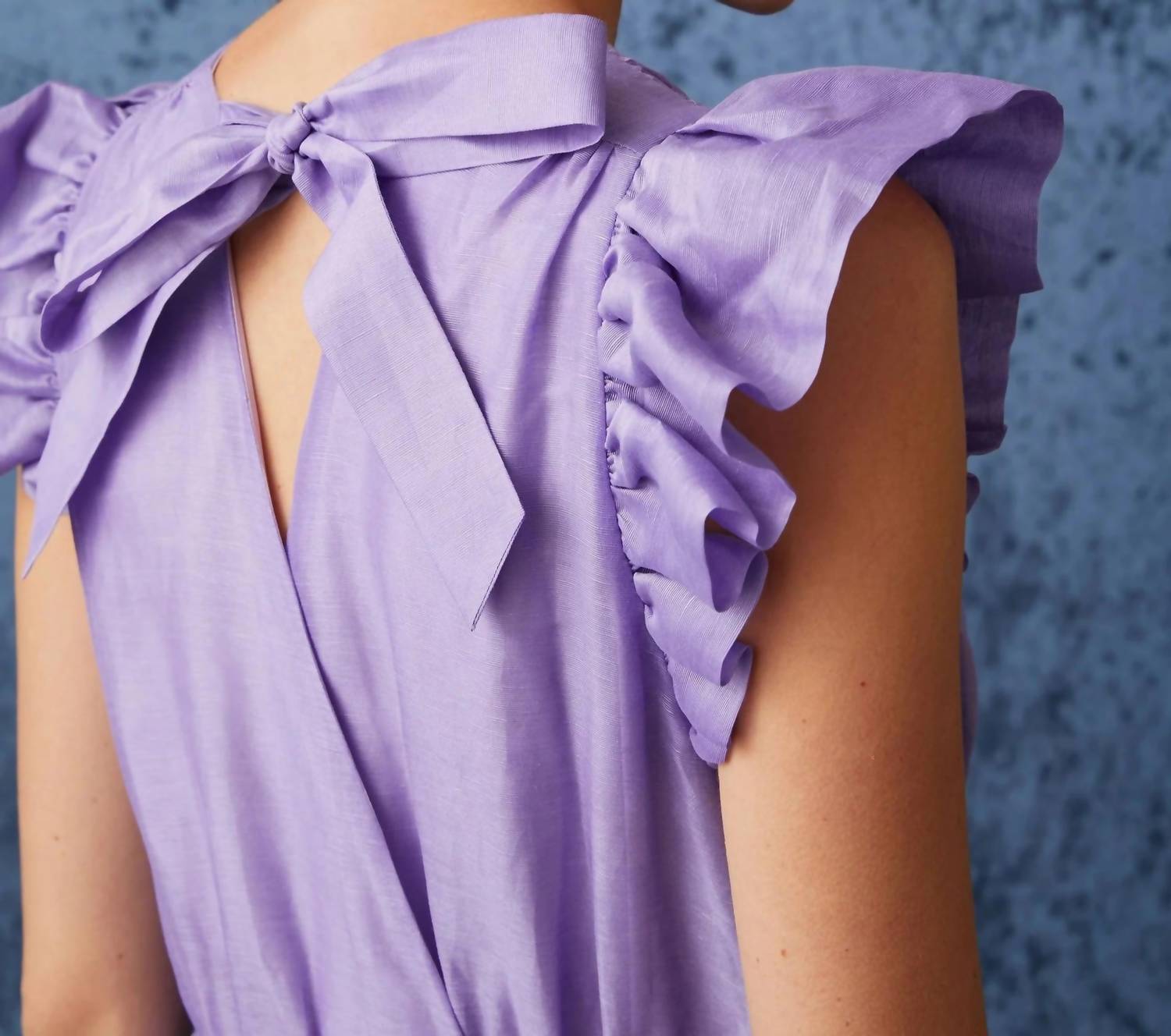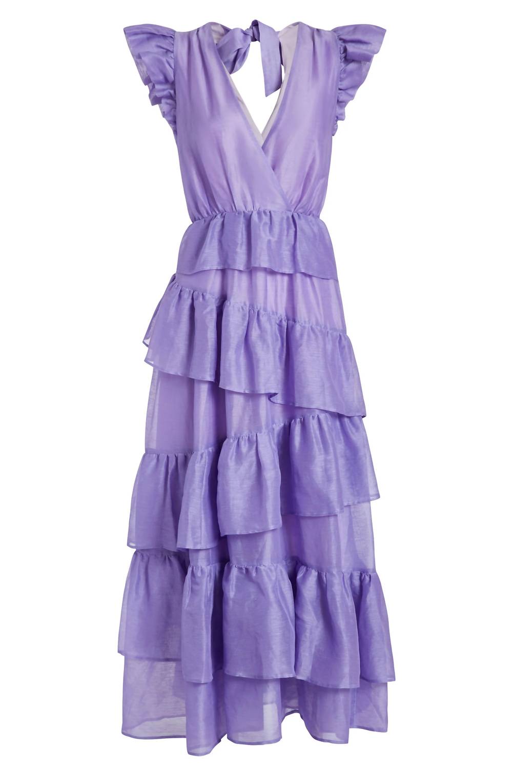 A maxi dress that is just as cute as it is comfortable. Meet the Marisol Dress by Marie Oliver, an enchanting piece in Aster Purple that adds sophistication to any occasion. This women's sleeveless maxi dress is crafted from a linen blend, showcasing a solid pattern and a flattering A-line silhouette with a wrap V-neckline. With a tiered ruffle midi skirt and an elastic waist, this dress promises comfort and style in one. Closure: Tie closure. Care: Dry clean only.