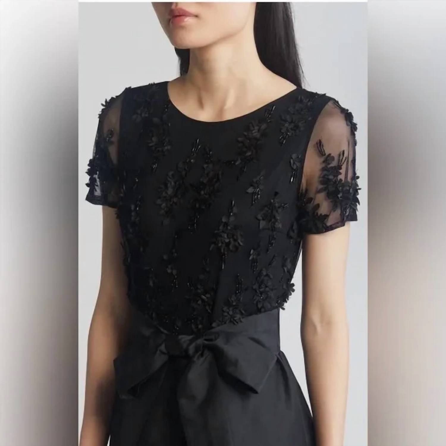 Step into elegance with the Pisarro Nights 3D Floral Bodice Beaded Gown Dress in timeless black. This gown features delicate short sleeves adorned with dainty beads and three-dimensional blooms, creating a stunning contrast with its glossy, textured skirt. Made from a premium blend of 70% polyester and 30% nylon, this imported dress offers a flattering 55" A-line silhouette, accentuated by a removable sash. Closure: Hidden back zip. Care: Spot clean only. Perfect for prom or any formal occasion, this gown embodies quiet luxury suitable for the spring season.