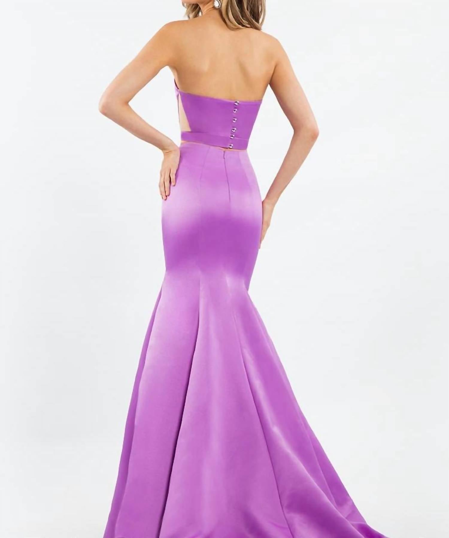 Embrace elegance with the Rachel Allan Matte Satin Two-piece Mermaid Gown, an exquisite choice in a solid lilac hue for your special occasions. This strapless design with a sweetheart neckline showcases a mermaid silhouette, crafted from luxurious satin. The gown features a convenient zip closure, offering a sleek fit without pockets for a seamless look. Perfect for prom, this ensemble highlights timeless sophistication and charm.