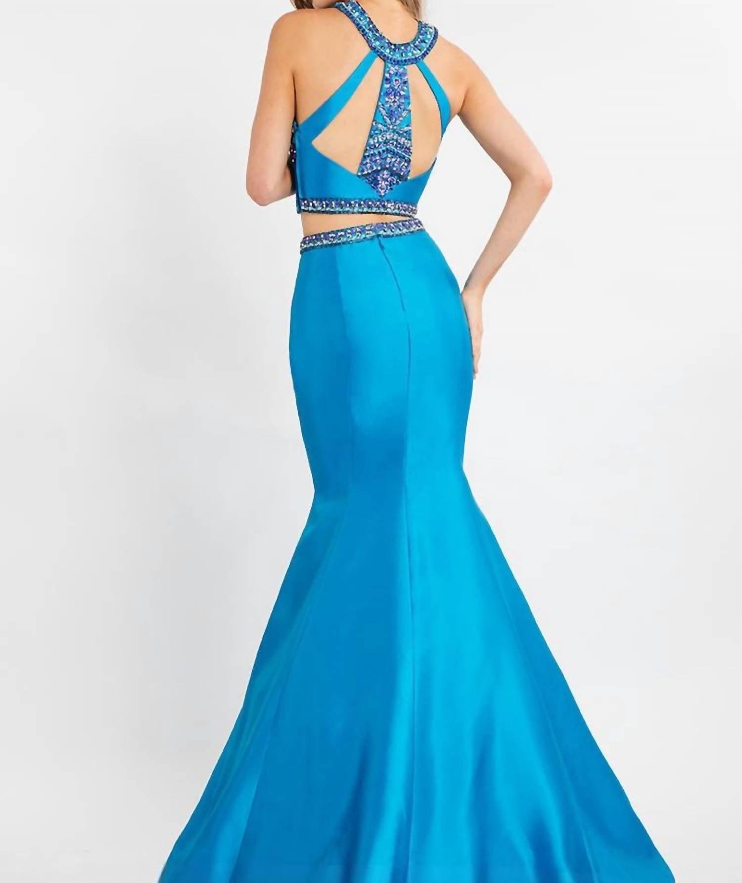 Just add a cute little clutch and a matching heel for the perfect event look. Make a splash at prom with the Mikado Two-piece Mermaid Gown from RACHEL ALLAN, crafted for a night to remember. This stunning ocean-colored gown is made from luxurious mikado fabric and features a sleeveless design with a halter neckline. The beaded bodice and waistline add a touch of sparkle, while the zip closure ensures a sleek fit. Designed for women who want to shine, this gown offers an elegant mermaid silhouette perfect for the occasion.