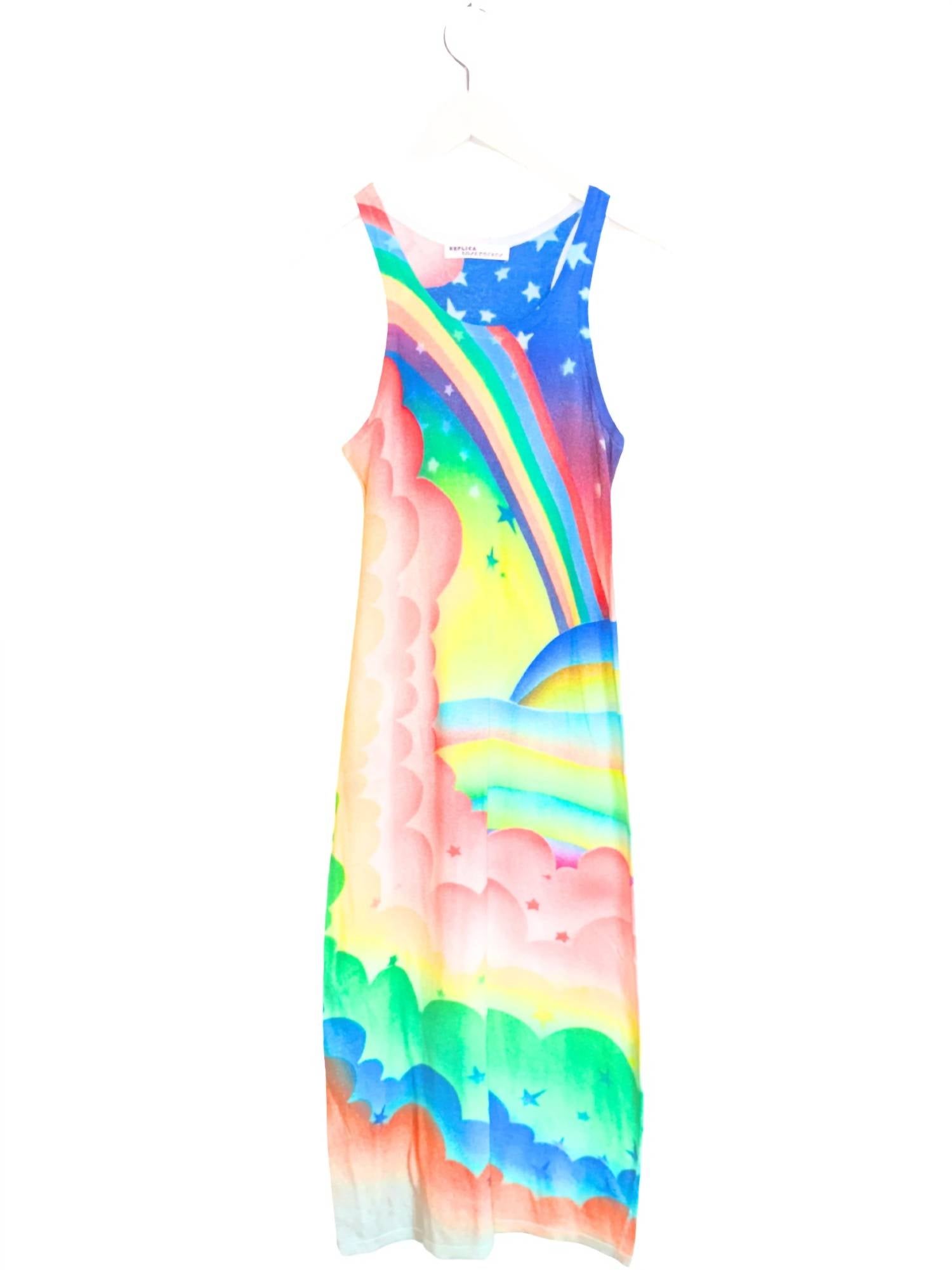 A midi dress so versatile, your options for wearing it are endless. Experience the vibrant stunning sleeveless piece that flaunts a multicolor graphic pattern. Crafted from a cotton blend. Midi-length dress features a slim bodycon fit and a wide racerback for a streetwear edge. Made from 50% Cotton and 50% Modal. Promises comfort and style, ideal for vacation or spring outings. Pull on. Machine wash cold.