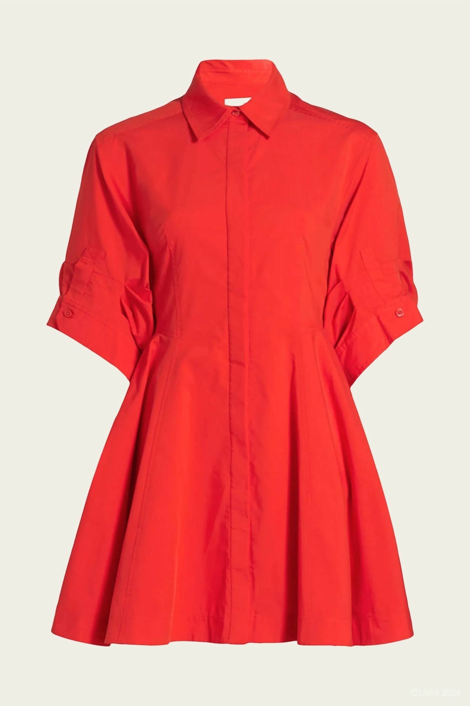 Introducing the Jazzie Short Sleeve Dress by SIMKHAI, a vibrant addition to your wardrobe in Fiery Red. This dress features elbow-length puff sleeves with button cuffs and a mini length measuring 32 inches from the shoulder. Made from a cotton blend of 63% cotton and 37% polyester, it boasts a lightweight, non-stretch poplin fabric and is fully lined with 100% cotton. Designed with a collared neck and covered button placket, it offers on-seam side pockets for added convenience. Imported from China and crafted with care, this dress requires dry cleaning to maintain its pristine look.