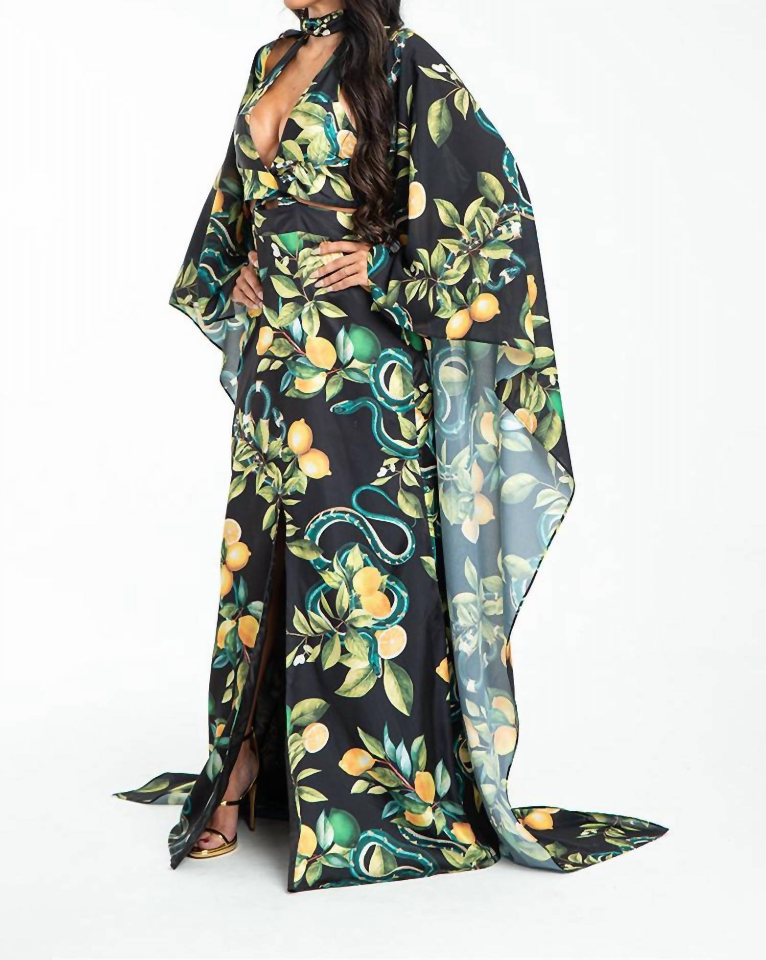 Embrace elegance with the Tropical Goddess Dress by Steffany Milano, a vibrant statement piece in a multi-colored tropical print. Perfect for a beach day, it features a sleeveless design, a chic V-neckline, and a striking thigh-high slit. Crafted from 85% Polyester, 10% Satin, and 5% Chiffon, this dress combines comfort with luxurious style. Ideal for those embracing a Boho Chic trend, it's a must-have for women looking to make an impression.