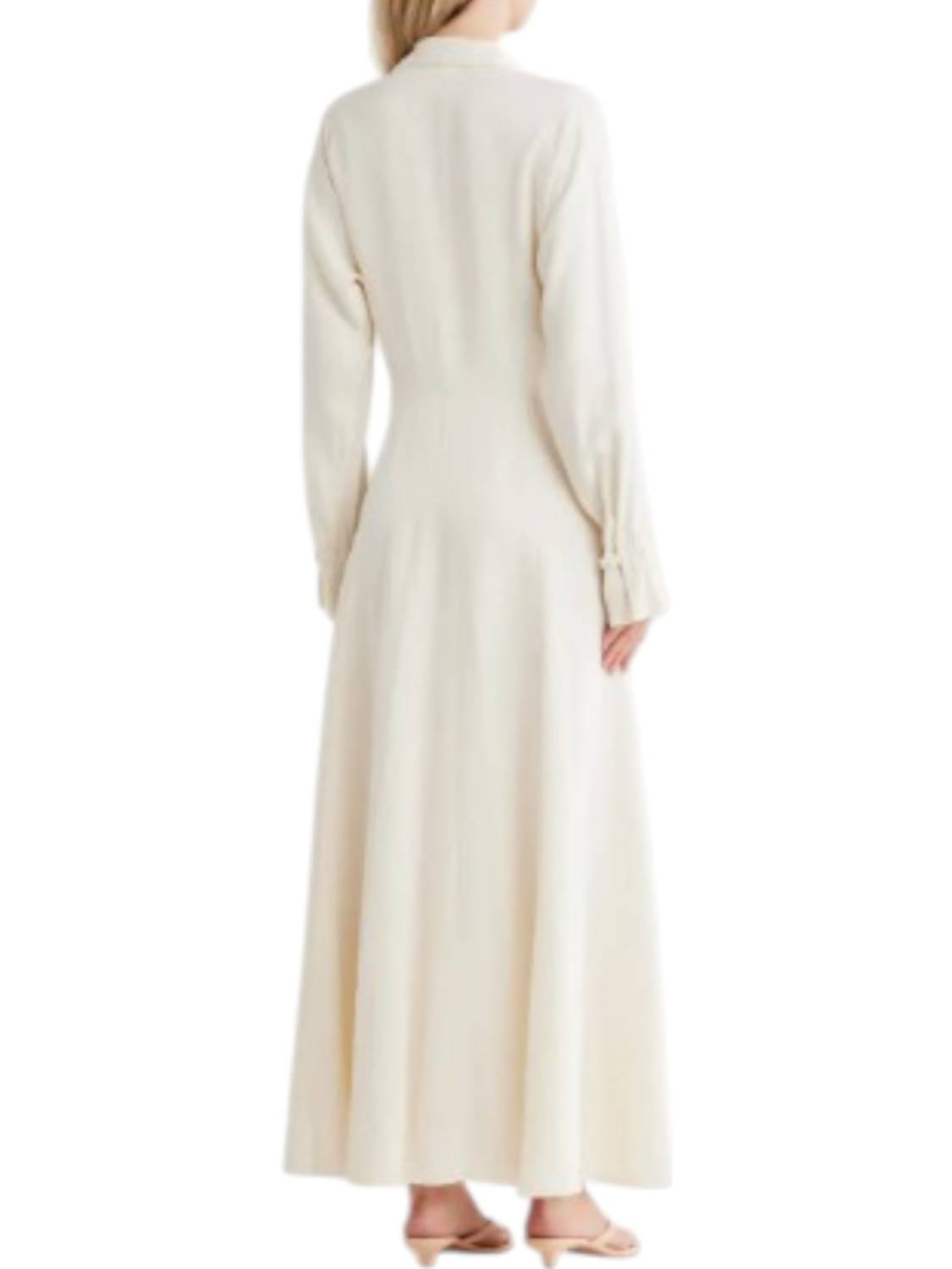 Who doesn't love a good maxi dress? This one you'll be reaching for season after season. Introducing the Lazy Hazy Days Of Summer Dress by TWP, a chic statement piece in bone for spring occasions. This long sleeve, midi-shirt dress is crafted from a luxurious blend of 76% viscose and 24% linen. Its elegant A-line silhouette is highlighted by a button-up closure, spread collar, and adjustable cuffs for a tailored touch. Made in the USA, this dress is best maintained through dry cleaning to preserve its maximalist appeal.