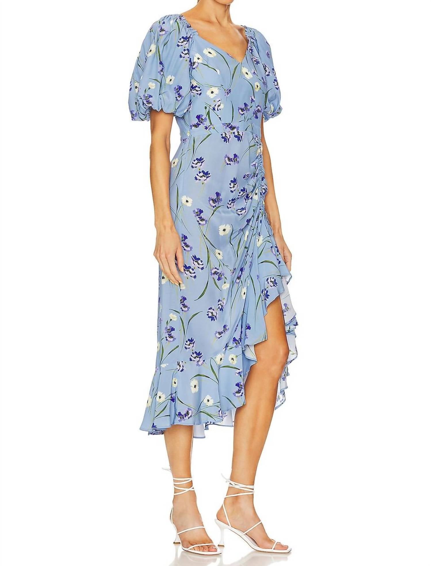 A midi dress so versatile, your options for wearing it are endless. This lightweight piece features puff sleeves with elastic cuffs and a drawstring front hem accented by a delicate ruffle trim. Designed without lining, it offers a soft, airy feel and secures with a hidden side zipper closure. Made from a smooth blend of rayon and viscose. Hand wash recommended.