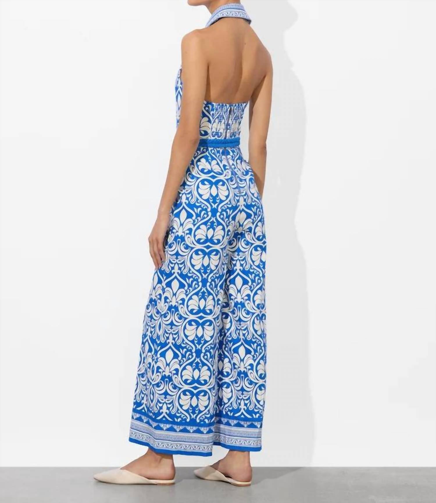 The Alara Wide Leg Jumpsuit by alice + olivia in Soiree True Blue is the epitome of summer fashion, combining elegance with playfulness. This ankle-length, patterned jumpsuit features a collared halter neck with a button front and hidden placket, side pockets, and an adjustable braided tie waist for a custom fit. Crafted from a luxurious blend of 56% linen, 43% viscose, and 1% elastane, it boasts a comfortable smocked back with a zipper closure. Care for it by dry cleaning only, and enjoy the vibrant style brought from the runways to relaxed vacation settings. Length from shoulder: 56"; Inseam: 27 1/4".