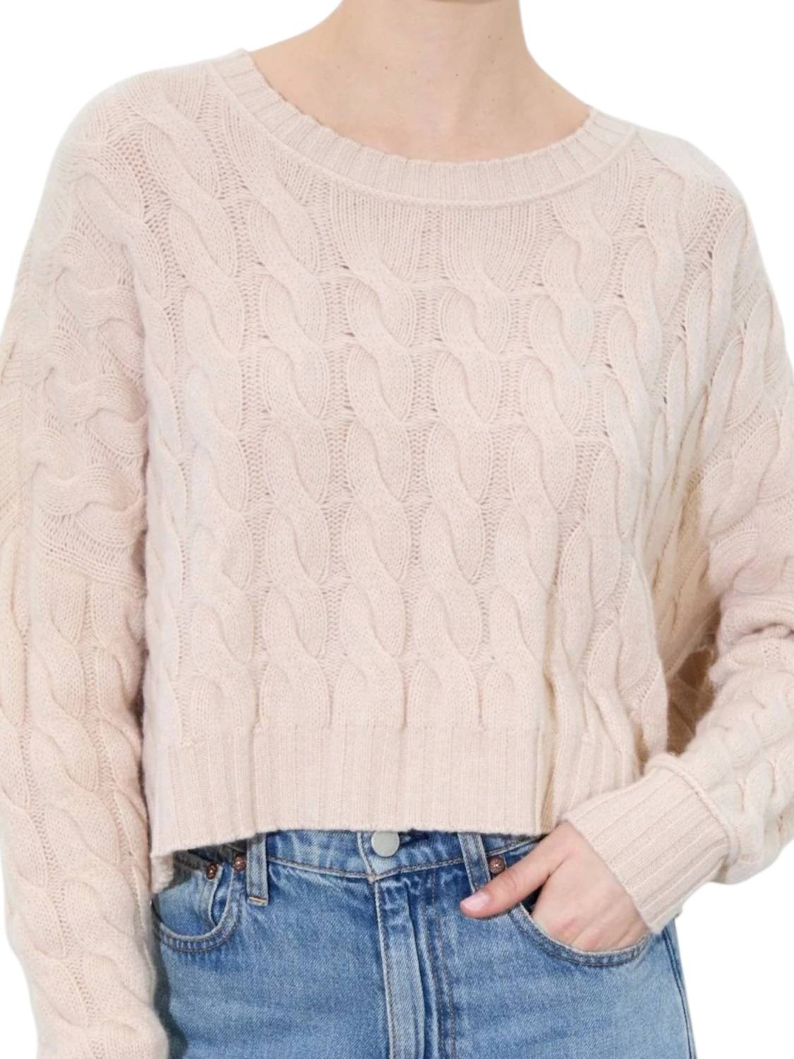 Discover the Cecilie Cableknit Pullover Sweater by alice + olivia, a sophisticated staple in a timeless beige hue. This women's pullover features long sleeves and a crew neck, crafted from a luxurious blend of 72% wool, 27% cashmere, and 1% nylon. Its cropped, boxy fit provides a modern edge while offering unparalleled warmth and softness. Imported and designed for minimalist style, this piece is perfect for spring dinner parties. Care: Dry clean only. Model wears a size small with measurements: 5'10" height, 32" bust, 23" waist, 34" hips. Length from shoulder: 19".