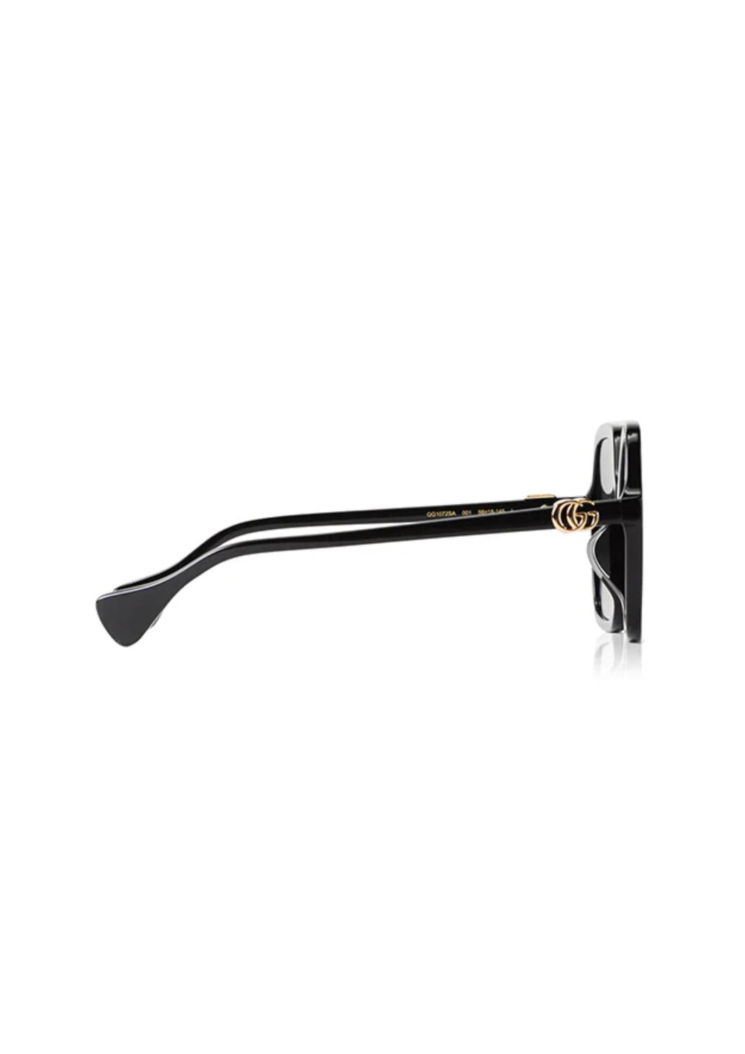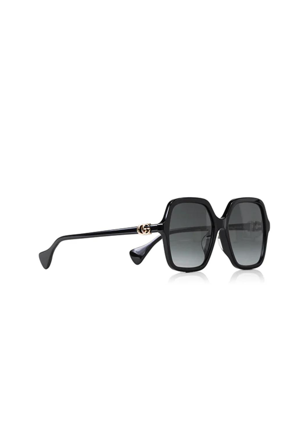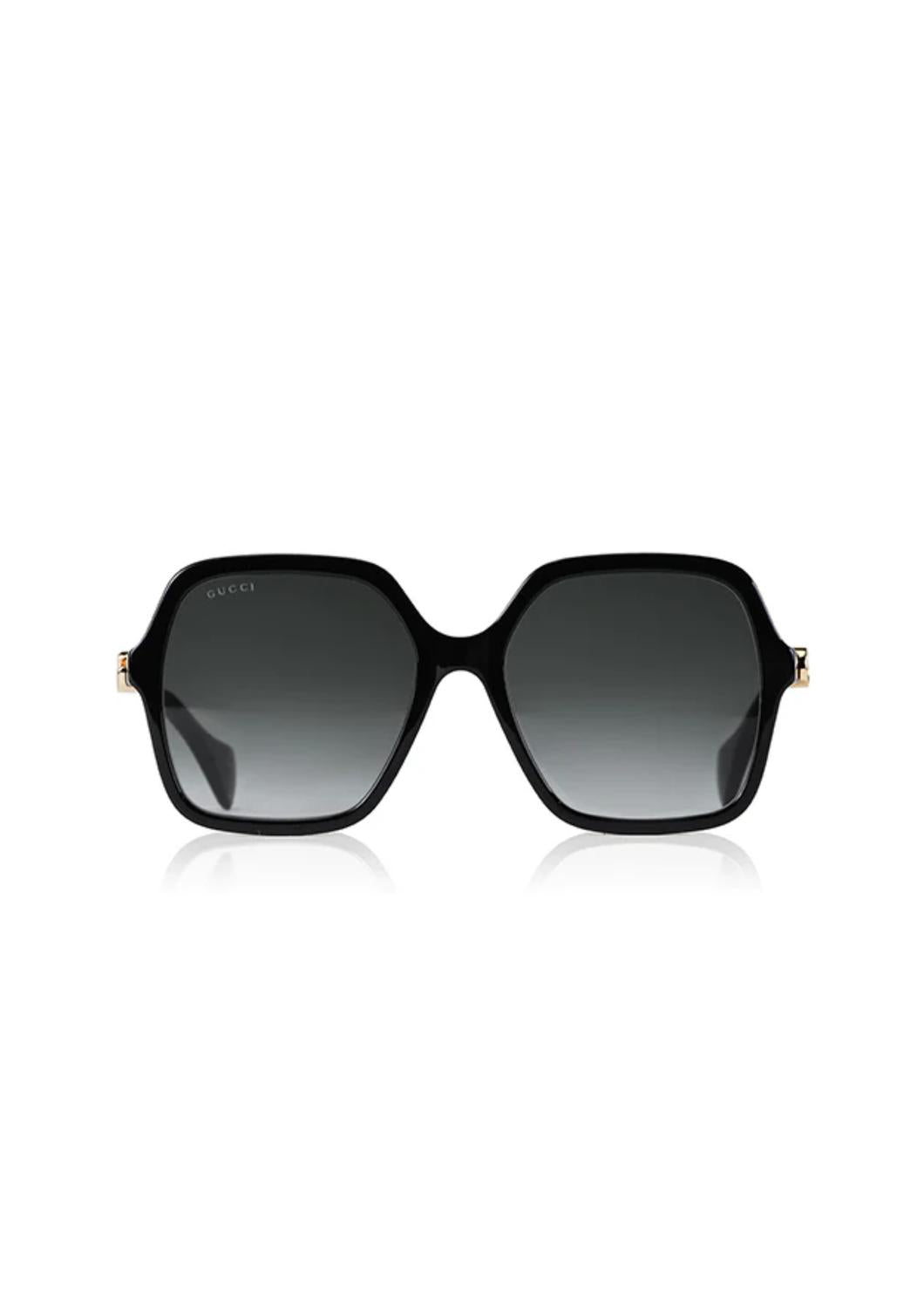 Upgrade your eyewear collection with these stunning sunglasses, meticulously designed to offer a perfect balance of style and functionality. Protect your eyes in style! Step out in style with the Women's Oversized Square Acetate Sunglasses by Gucci, a luxurious accessory made in Italy. Featuring a shiny black acetate frame and chic black gradient lenses, these sunglasses offer 100% UVA protection. The design is completed with an elegantly gold interlocking G detail on the temples. Dimensions: 56mm lens width, 18mm bridge length, 145mm temple length. Includes a Gucci hard case and cleaning cloth for ultimate care.