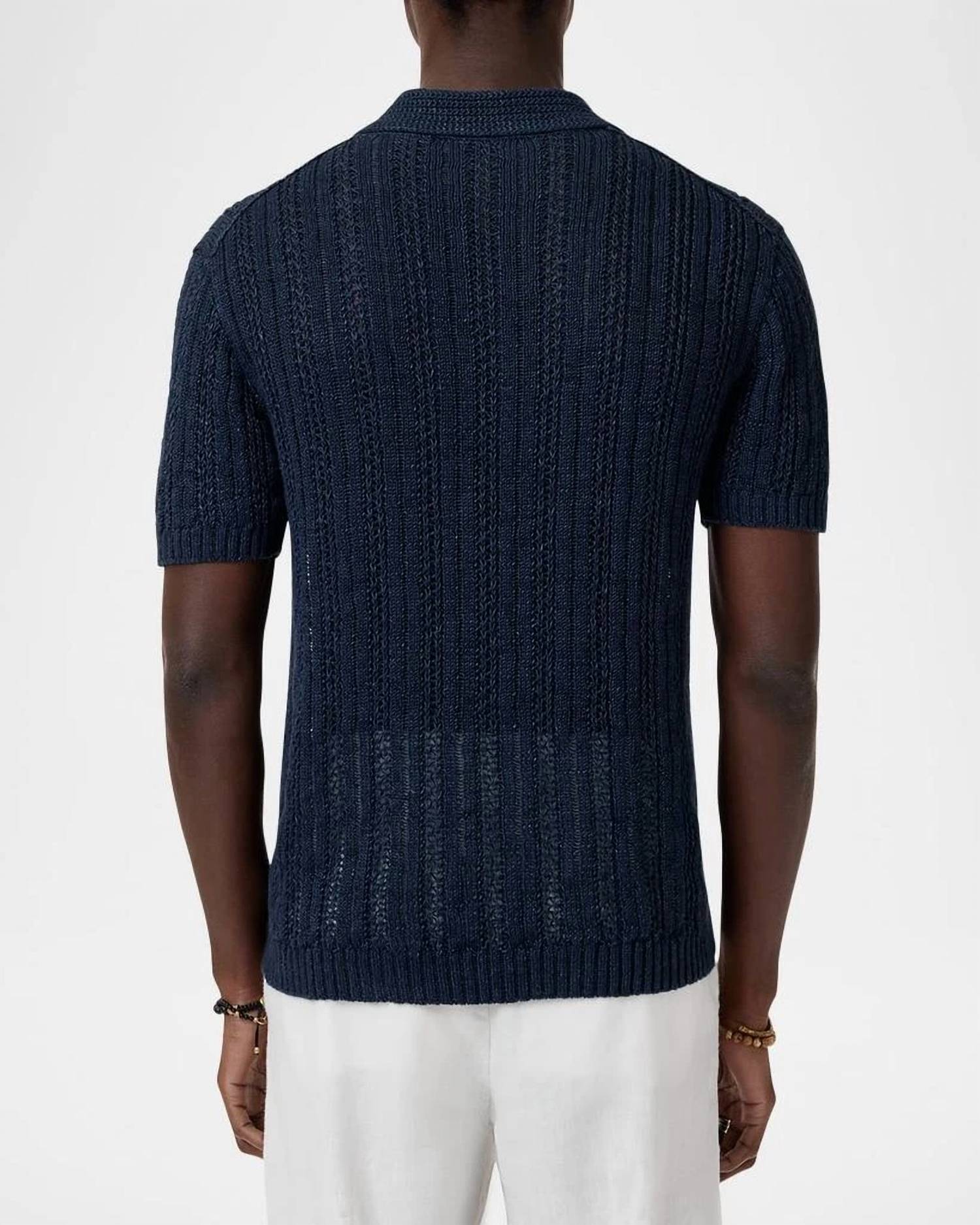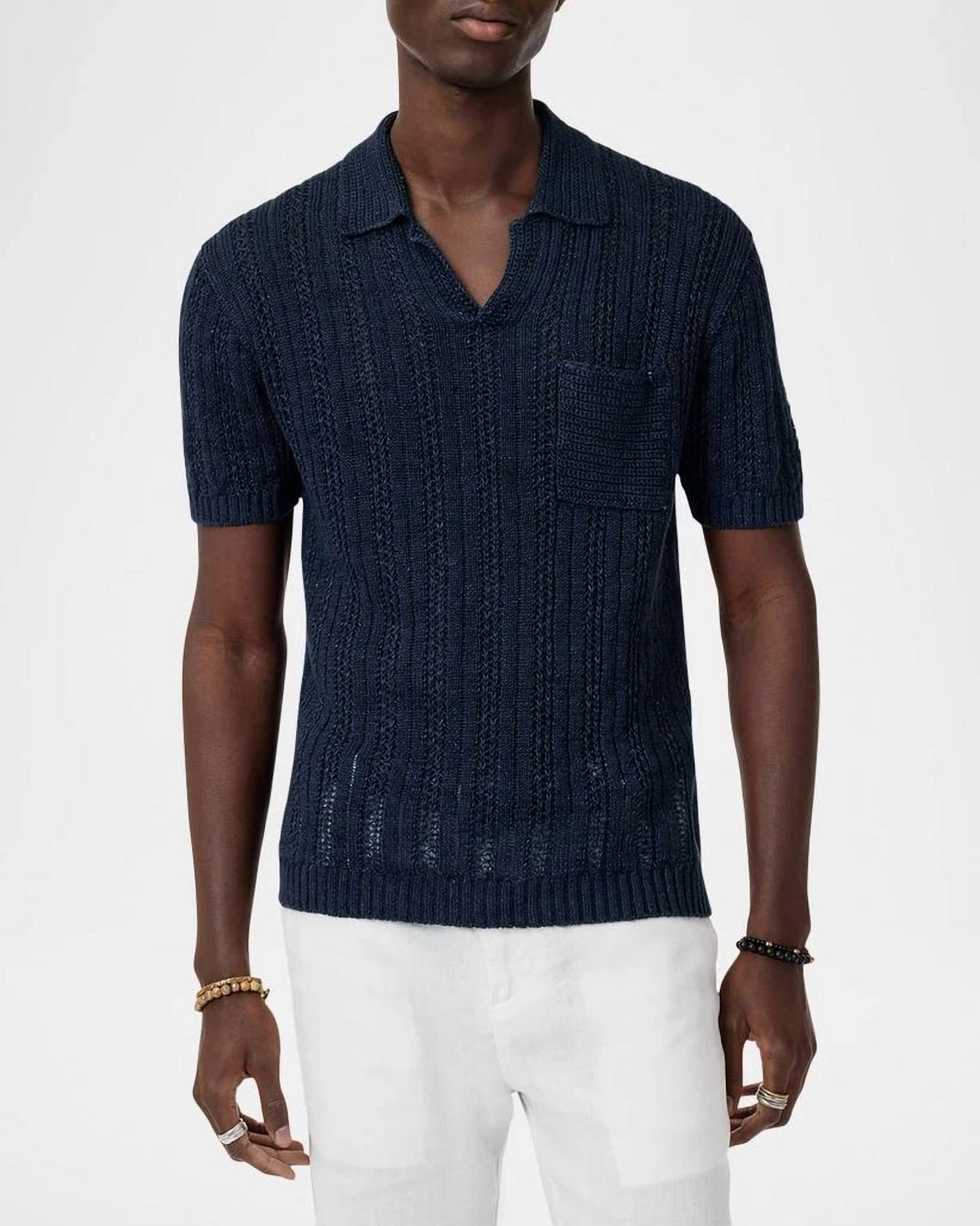 The Odin Linen Sweater Polo by John Varvatos in navy is a sophisticated choice for the modern man. Its short sleeves make it ideal for summer seasons and minimalist style enthusiasts. Crafted from 100% linen, this solid-colored piece ensures comfort and breathability. Care: Machine wash. Perfect for vacation occasions, this polo embodies relaxed elegance.