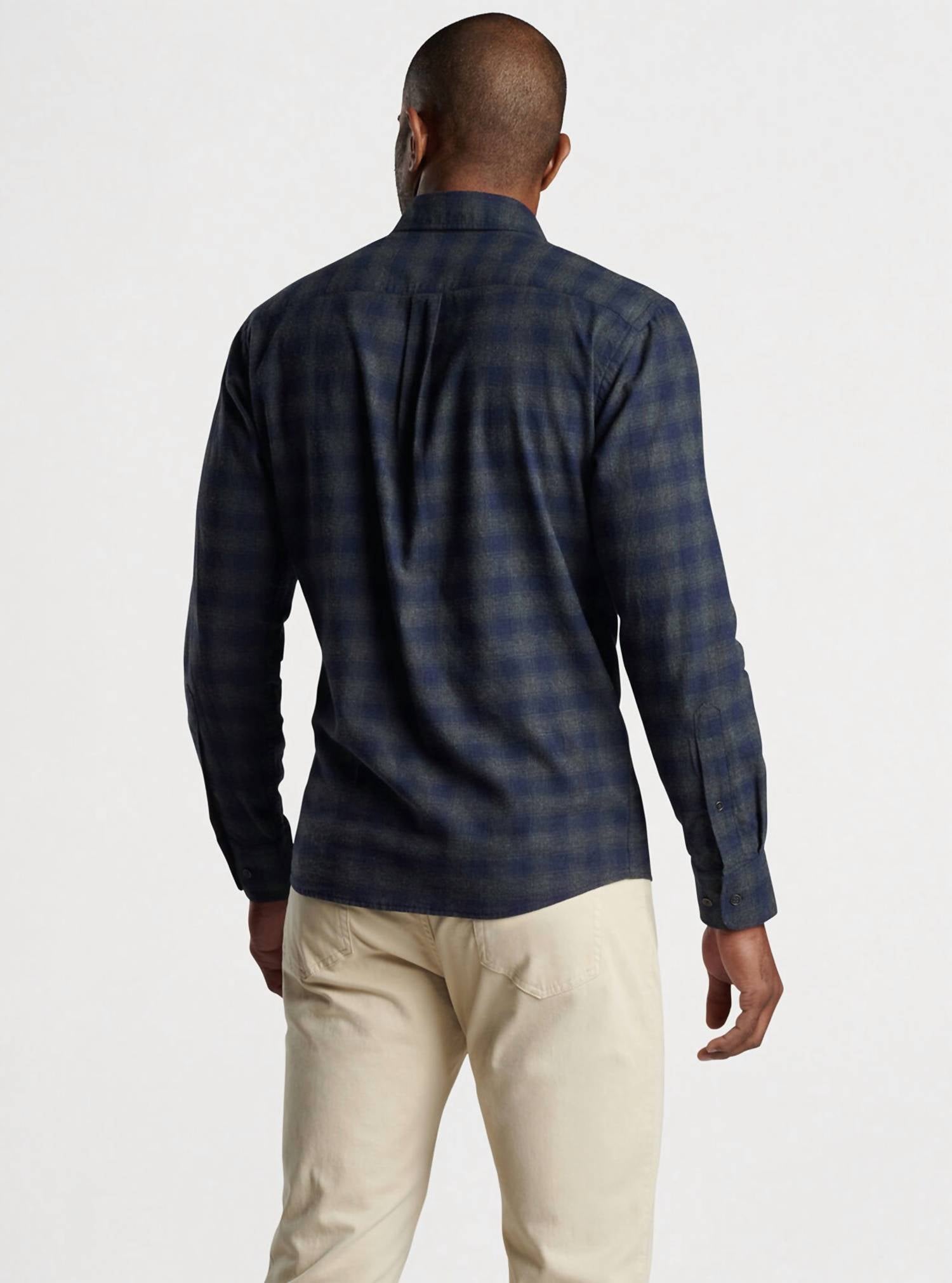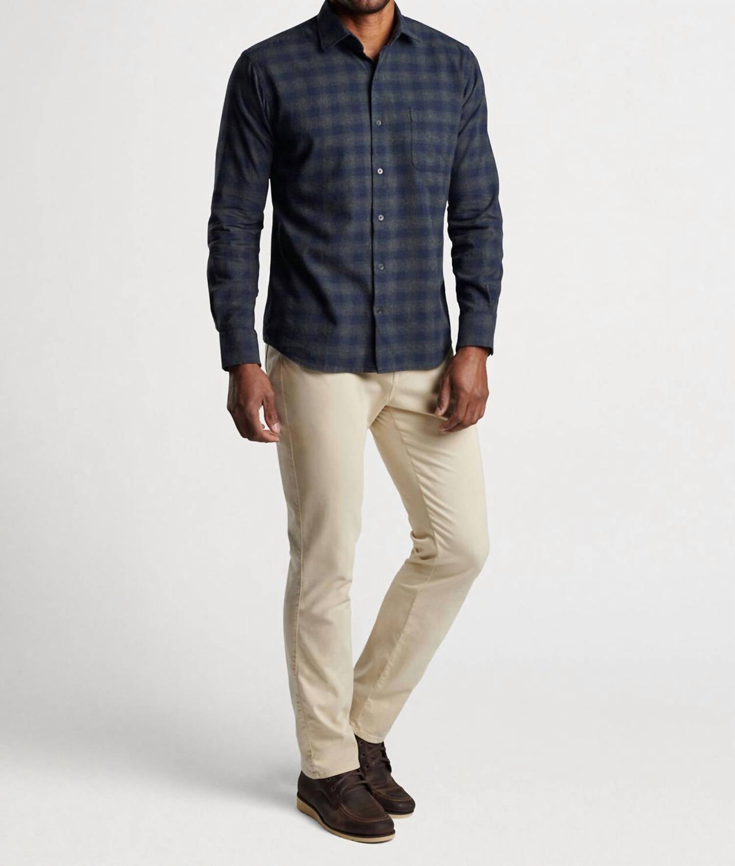 Elevate your casual wardrobe with the Men's Terrace Cotton Sport Shirt by PETER MILLAR, crafted from ultra-soft cotton in a sophisticated plaid & check navy pattern. This shirt features long sleeves, a spread collar, and a convenient button closure, complete with slightly brushed pewter buttons for a laid-back look. Designed for versatility, it comes with a shorter length that is perfect for wearing untucked. Care for this stylish piece by machine washing and laying it flat to dry.