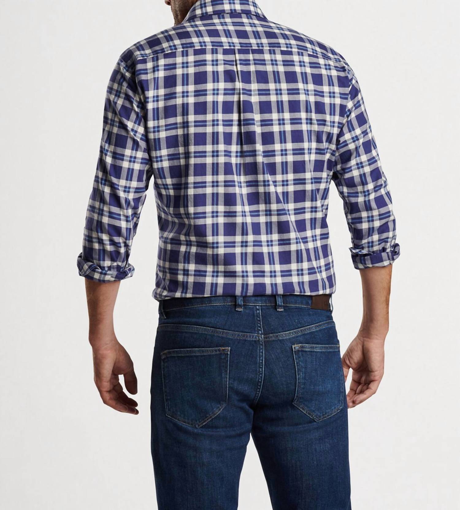 Elevate your casual wardrobe with the Men's Truett Cotton Sport Shirt by Peter Millar, tailored for style and comfort in a versatile navy plaid. Crafted from ultra-soft, breathable cotton twill, this shirt features a long sleeve design and a classic collar neckline. It offers a sophisticated finish with its spread collar, French placket, and double-button barrel cuffs. For convenience, enjoy the practicality of a pocket and a button closure. Care is simple with machine wash and lay flat to dry instructions.