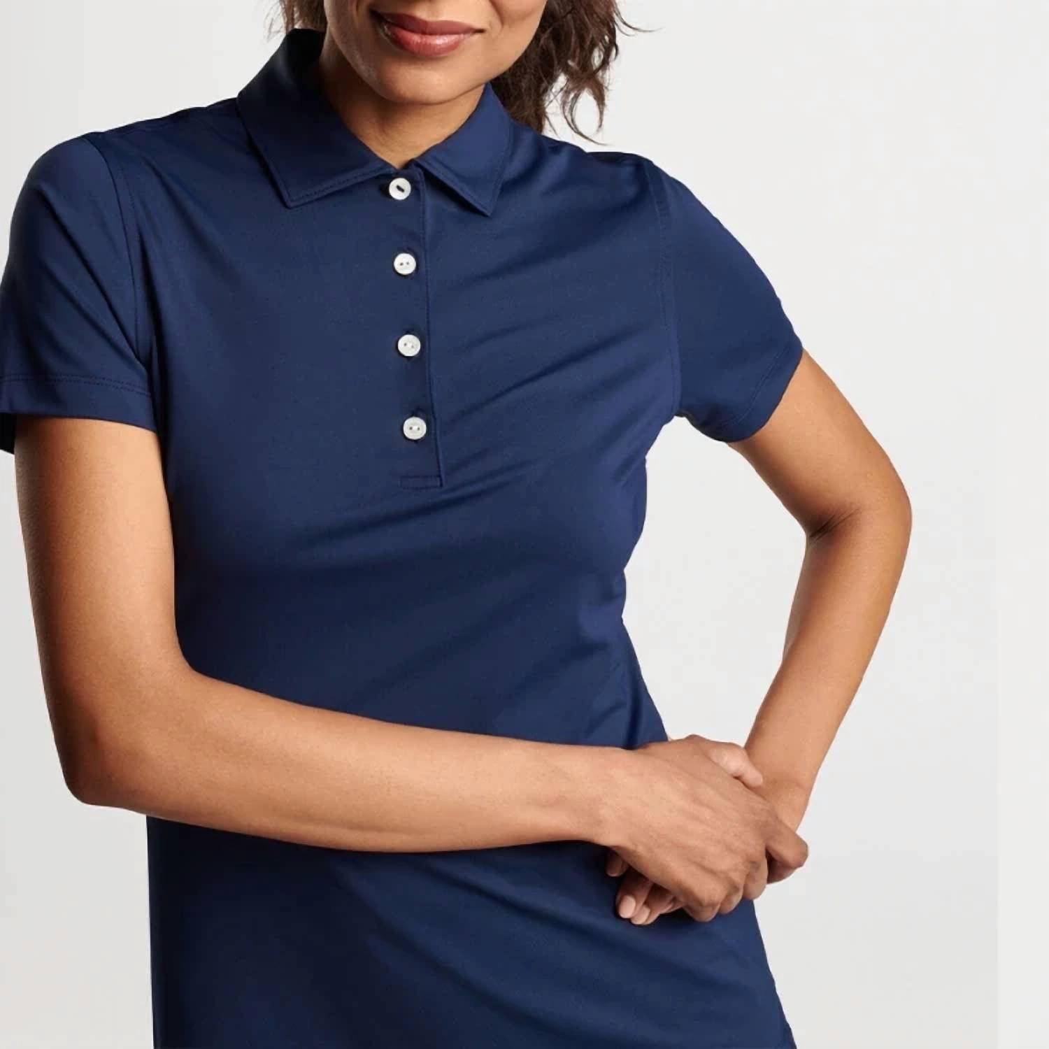 Look no further, you just found your perfect tee! Discover the Short Sleeve Button Polo by PETER MILLAR, a refined navy tee blending minimalism with supreme functionality. This polished top showcases short sleeves and a self-fabric collar with a four-button placket, tapering into a notched hem for contemporary flair. Composed of 94% Polyester and 6% Spandex, it offers superior softness, four-way stretch, and durability, complete with UPF 50+ sun protection. Closure is achieved via buttons, and the easy-care fabric is machine washable with tumble dry low instructions, ensuring convenience for your active lifestyle.