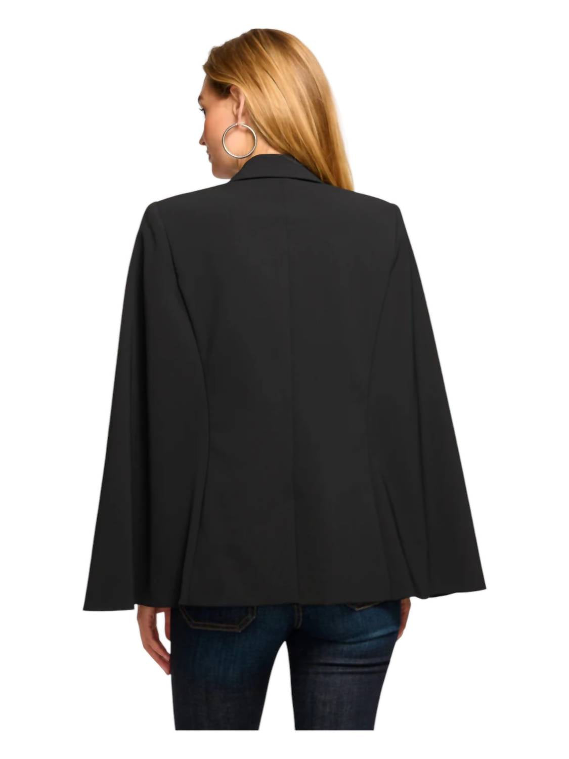 Tailored to perfection, this blazer will be your go-to jacket for years to come. Tailored blazer-style cape. Peak lapels; single-breasted front. Strong padded shoulders. Long split sleeves. Hip besom pockets. Mid-length. 95% Polyester 5% Elastane.