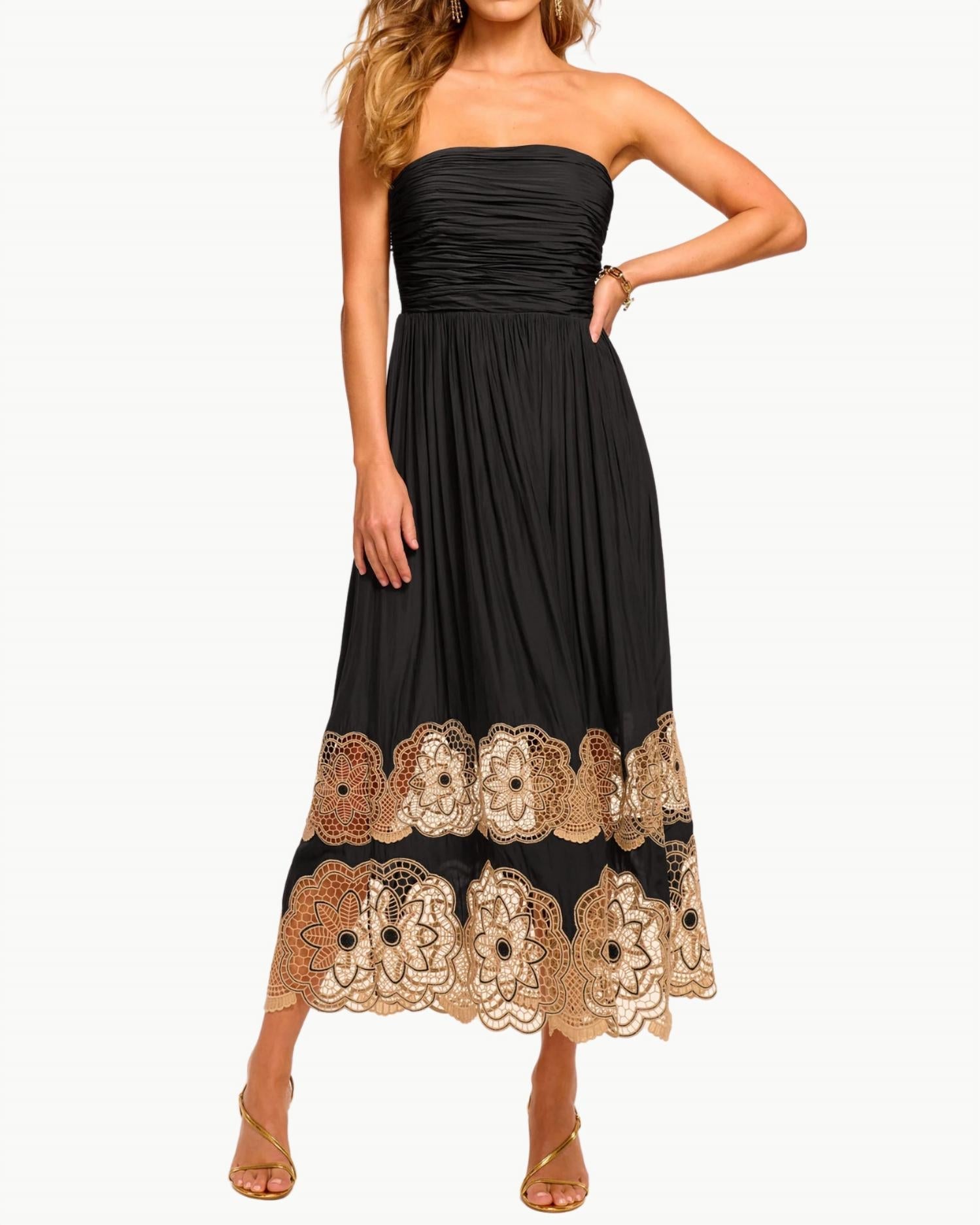 No straps necessary! Experience elegance with the Milani Embellished Strapless Maxi Dress by Ramy Brook, a captivating piece in classic black. This strapless dress, crafted entirely from luxurious polyester, features a flattering ruched bodice and intricate cutout embroidery on its skirt, offering a modern touch to your evening ensemble. At 55 inches in length, this A-line silhouette is perfect for special occasions, providing both comfort and style. The pull-on style offers ease of wear, while care for this statement piece includes dry cleaning or hand washing as recommended.