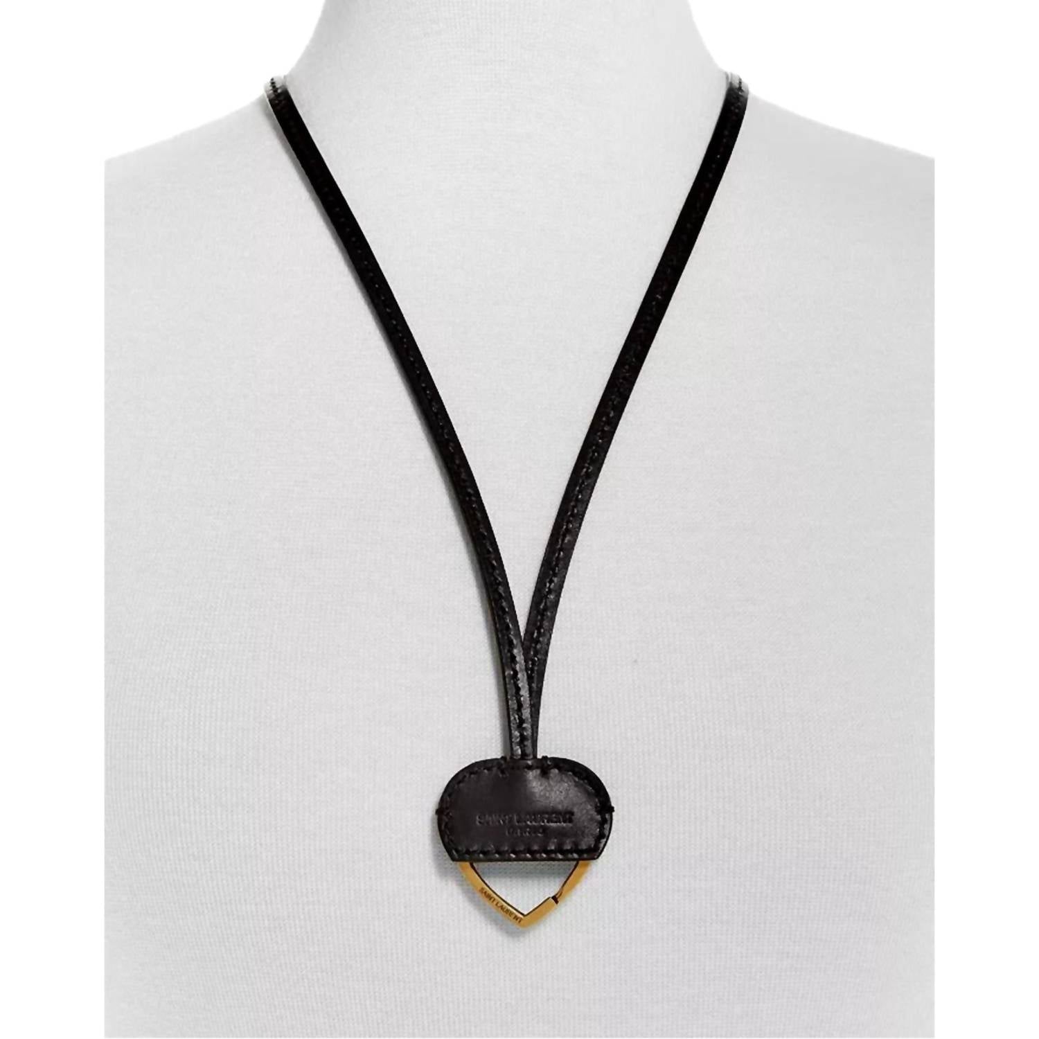 Discover the Saint Laurent Opyum Black Heart Keyring Necklace, expertly fashioned with a chic patent leather lanyard adorned with a striking leather and gold-tone metal heart detail. This versatile piece seamlessly transitions between a sophisticated necklace and a practical keyring. The necklace has a drop of 15.5 inches, while the heart keyring measures 1.5 inches square. Crafted in Italy, it includes Saint Laurent authenticity cards and a dust bag.