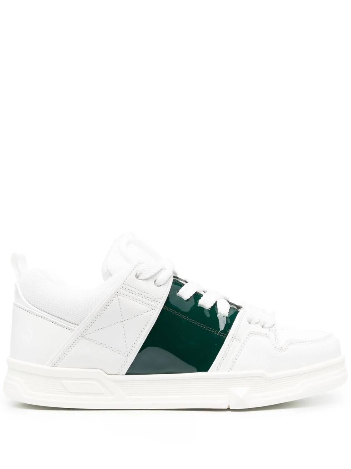 Cute, functional, and comfortable. These sneakers check all the boxes. Introducing the Women's Open Skate Leather Sneakers by Valentino Garavani, crafted in Italy with the perfect blend of style and comfort. These sneakers feature a sleek round toe, perforated toe box, and a front lace-up closure. Made from 100% calf leather with a fabric lining and a durable rubber sole, they boast a flat heel style ideal for travel. They embody a chic aesthetic with a logo-embossed tongue and patent leather band, ensuring you step out in sophistication.