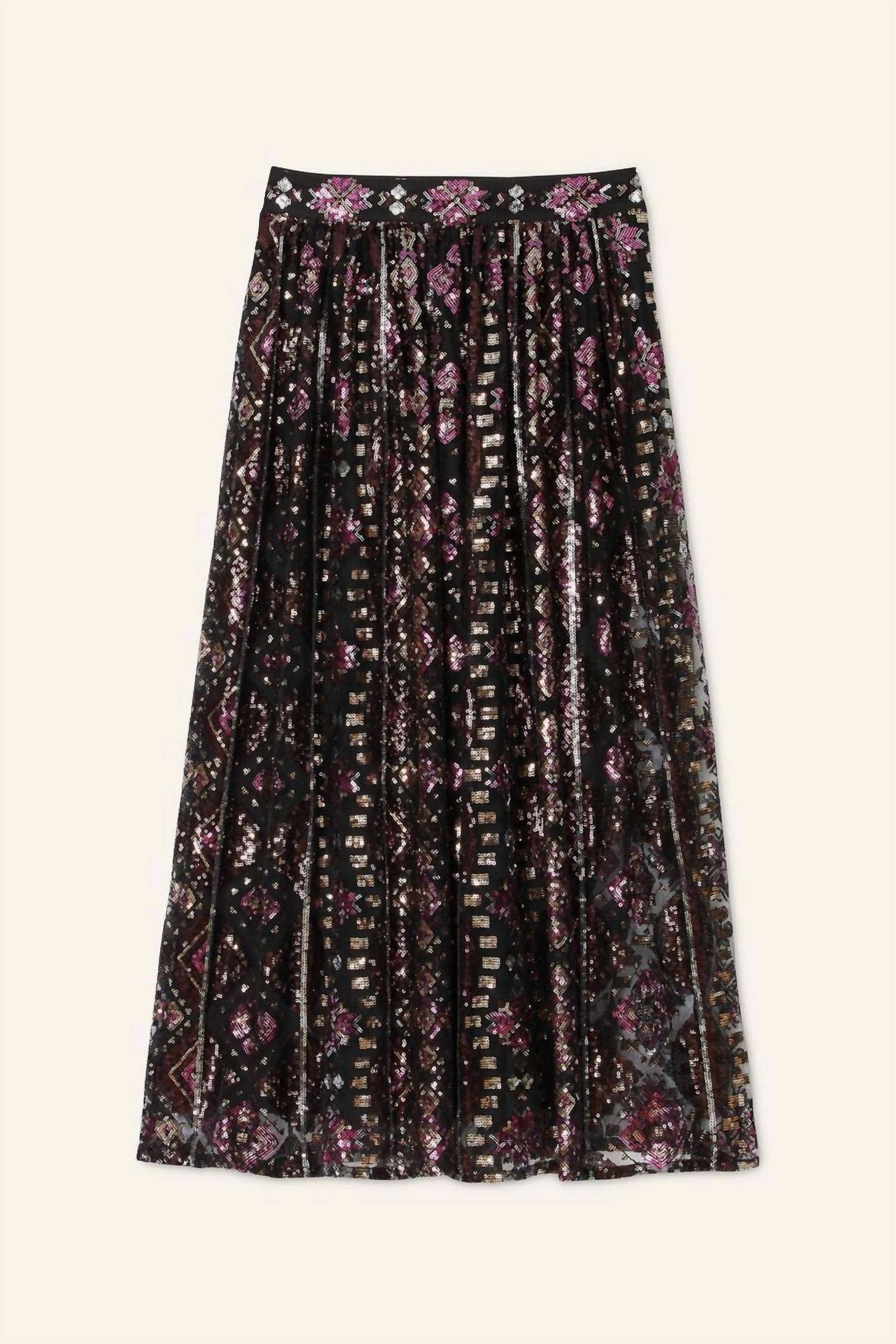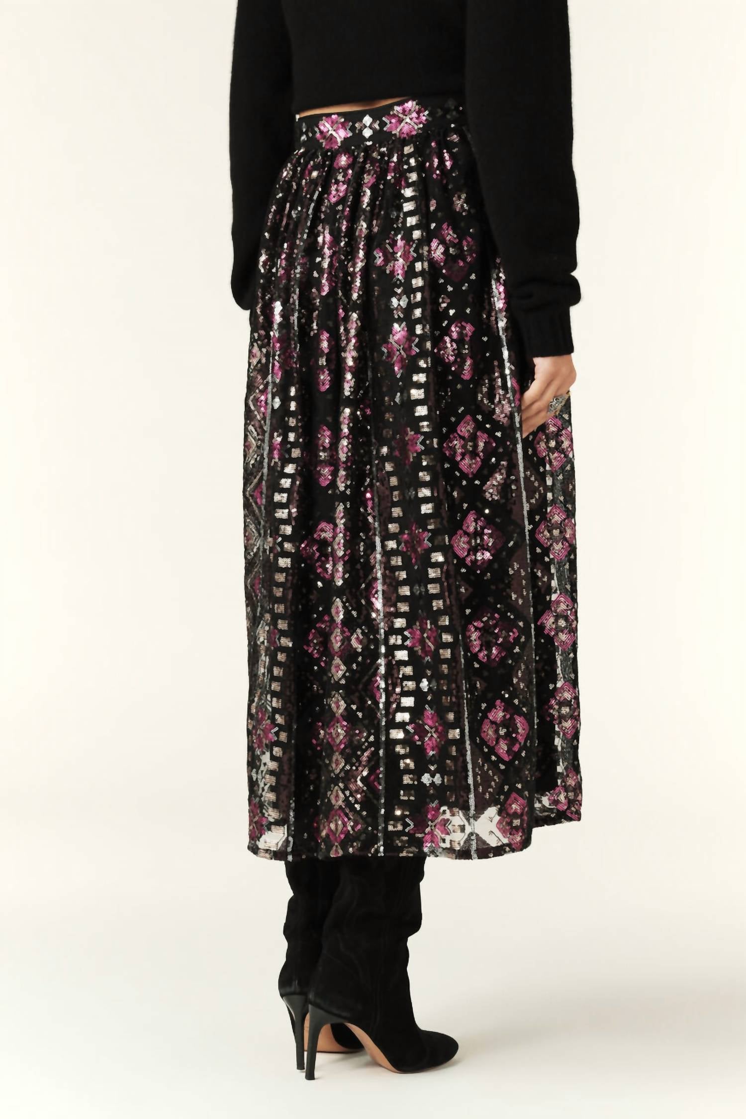 The Pippa Mid-length Skirt by ba&sh in Noir is a statement piece designed for the boho chic fashionista. This patterned midi skirt is perfect for occasions like a music festival or a New Year's Eve party. It features a convenient zip closure for easy wear. Care instructions include hand washing and laying flat to dry, ensuring the skirt's vibrant look is maintained.