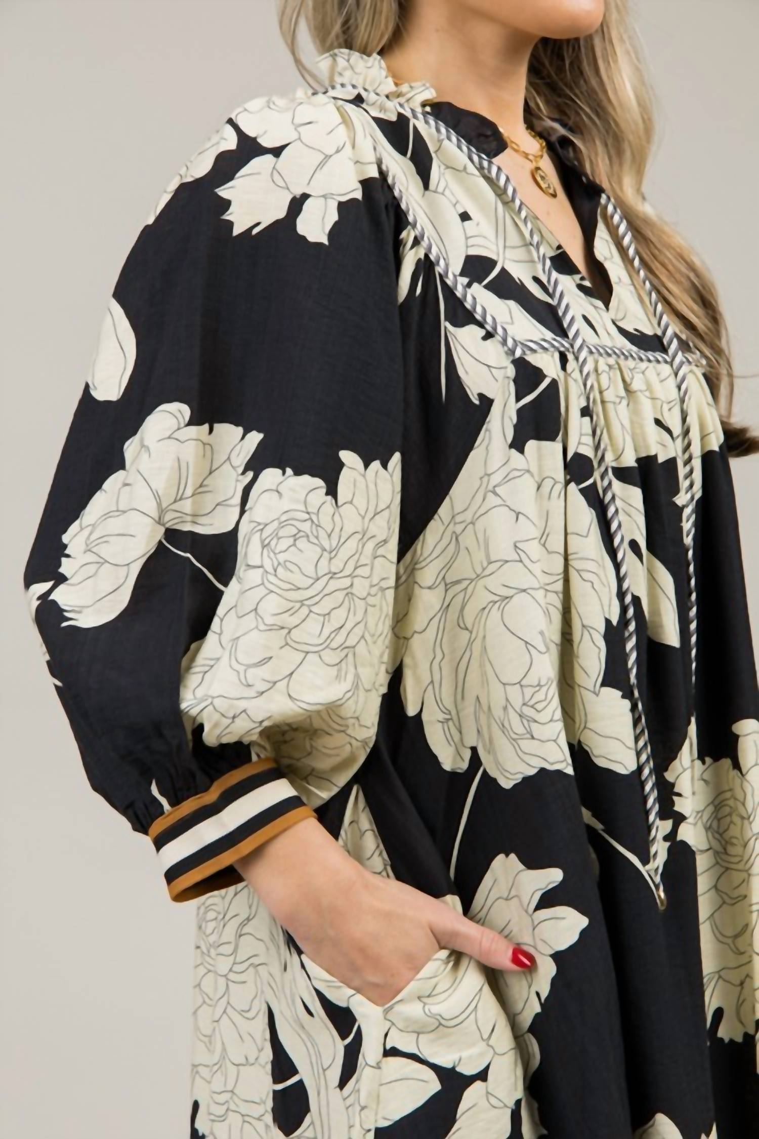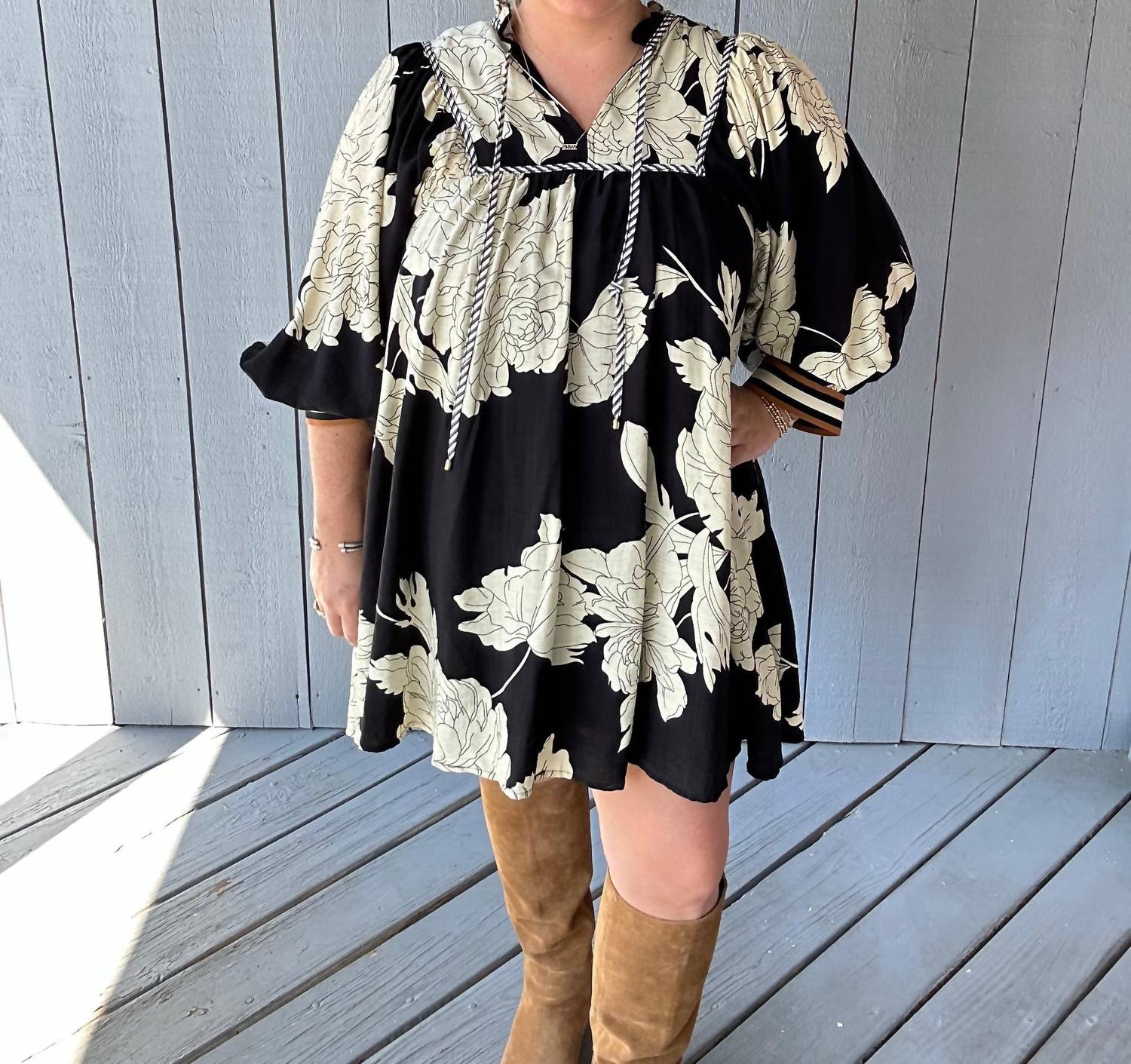 A short and breezy dress for those warmer days. Introducing the Boho Floral Mini Dress by Entro, a versatile piece in multi-color that's perfect for any occasion. This dress features short sleeves and a relaxed A-line silhouette for a flattering fit. Crafted from a blend, it contains 83% Rayon and 17% Nylon for a lightweight and breathable wear. It offers a pull-on closure for ease of use and is designed for hand washing. Model is 5'1" wearing a Large, perfect for styling up with wedges for a chic evening or down with sandals for a relaxed daytime look.