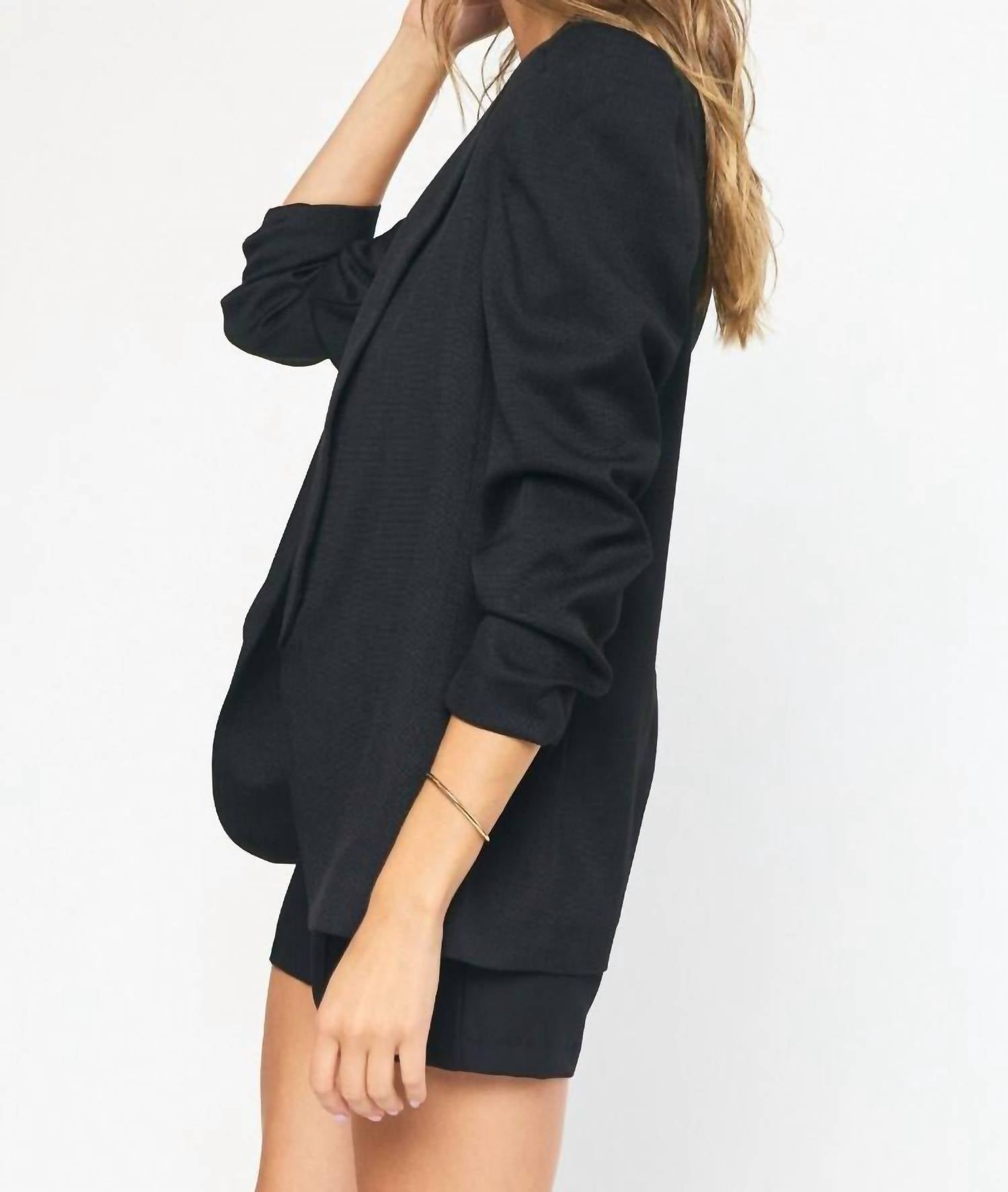 An elevated version of your favorite classic blazer. Elevate your workwear with the Open Front Blazer Jacket by Entro, a chic piece perfect for dinner parties or New Year's Eve celebrations. This black blazer features long sleeves and a stylish collar, complemented by shoulder pads for a structured silhouette. With a solid pattern and faux front pockets, it effortlessly combines function and style. Closure: Button closure. Care: Dry clean only.