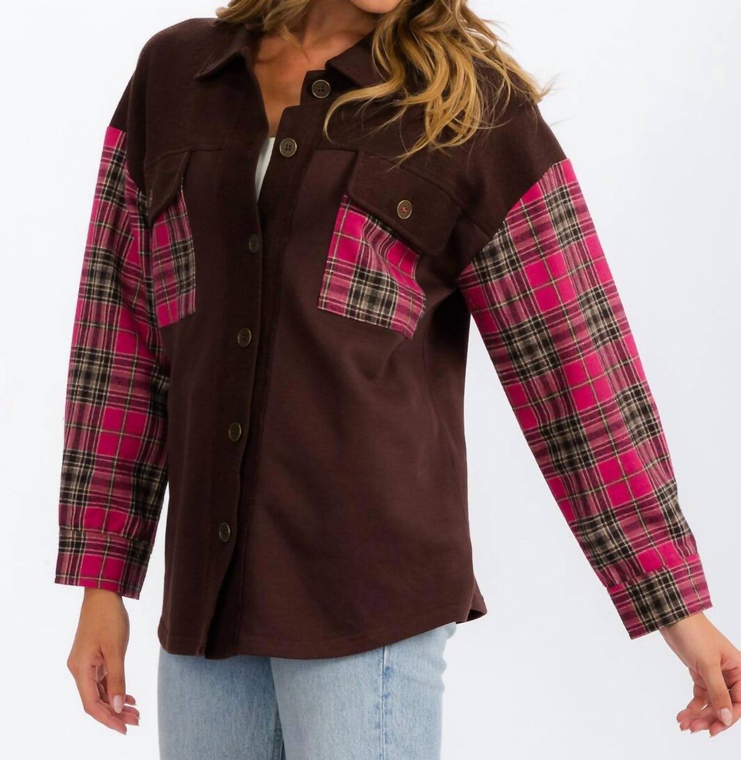 Perfectly tailored and soft to the touch. Introducing the Entro Plaid Detail Shacket, a stylish blend of brown and pink designed for versatility. Featuring long sleeves and a button closure, this shacket is crafted from a breathable cotton-poly blend. Its plaid pattern brings a trendy touch to the classic collar design, complemented by two functional front pockets. Care for this piece is easy with machine wash and tumble dry instructions, making it perfect for fall travel and layering over your favorite casual looks.