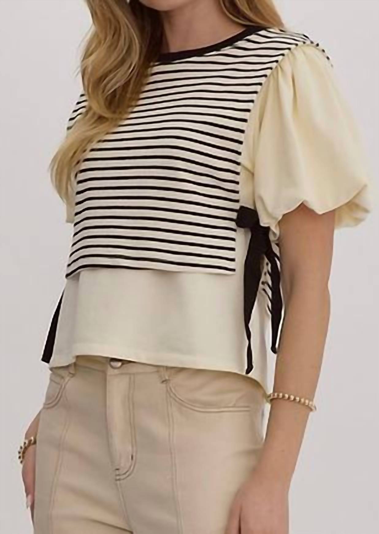 Chic addition for fall fashion that embodies 90s style. Cream multi-colored blouse showcases short bubble sleeves and a classic crewneck. With a pull-on style and charming self-tie bow details at the sides, both playful and sophisticated. Pattern: Stripe. Hand wash. Ideal for travel and casual outings, this versatile piece is perfect for a range of occasions.